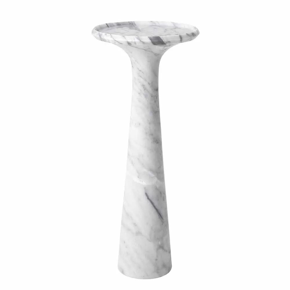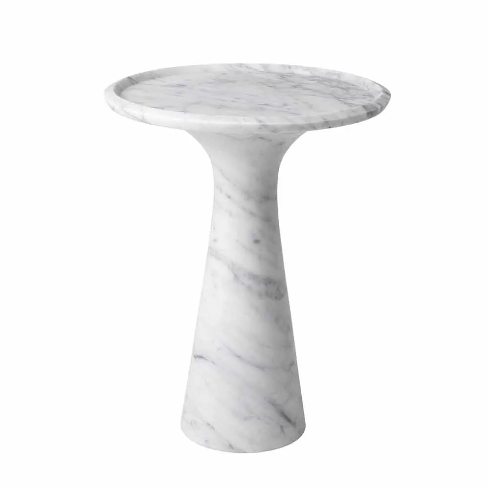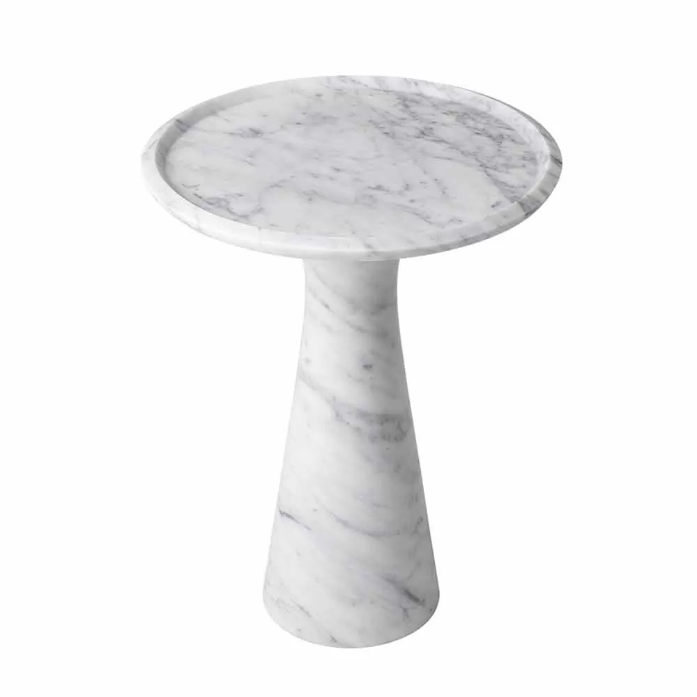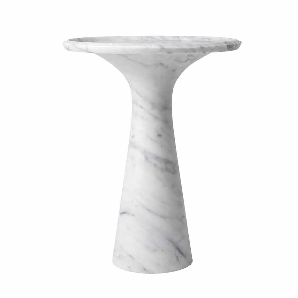 This coffee table has a round top with a raised edge and is entirely made of white Carrara marble, representing a real object of refined design .