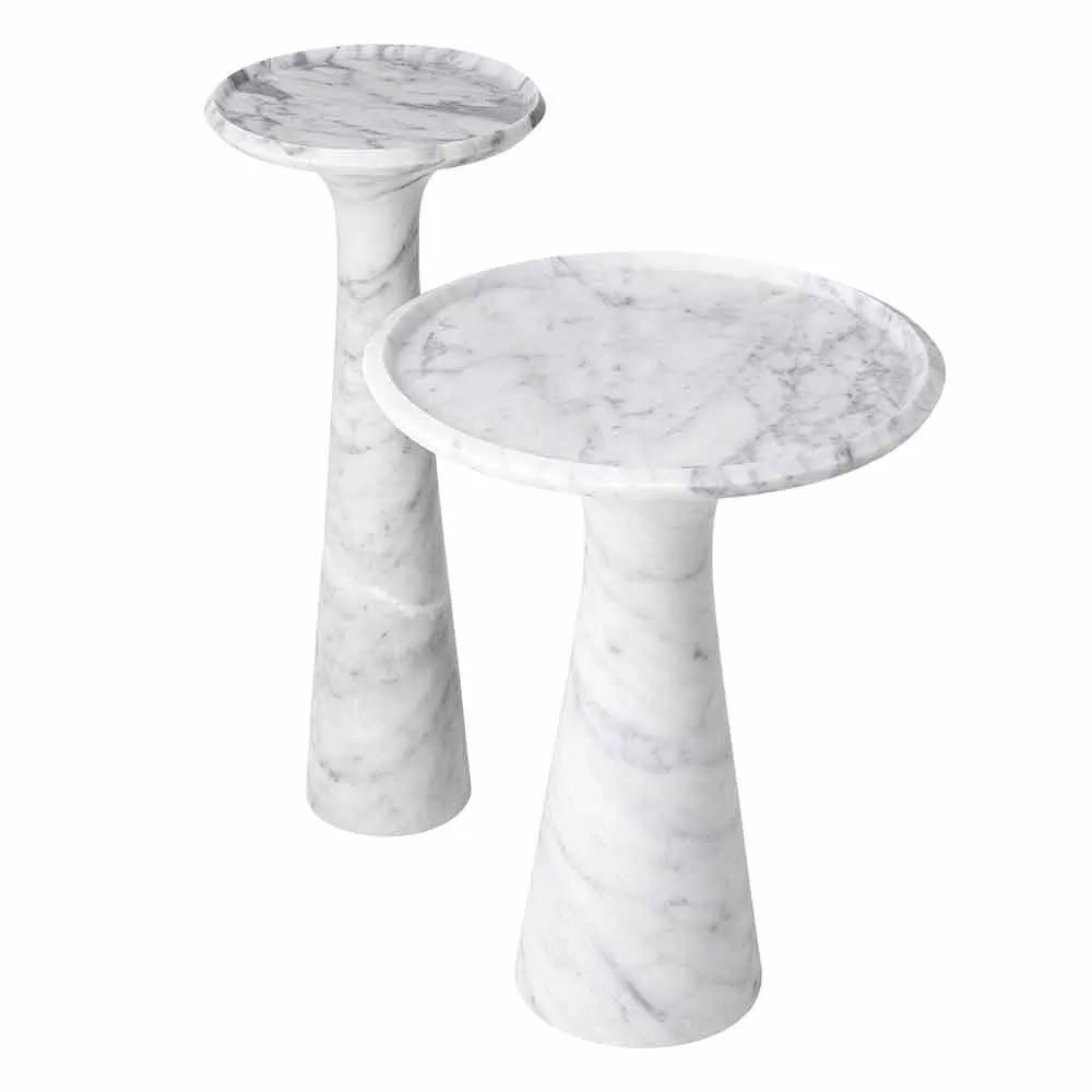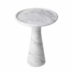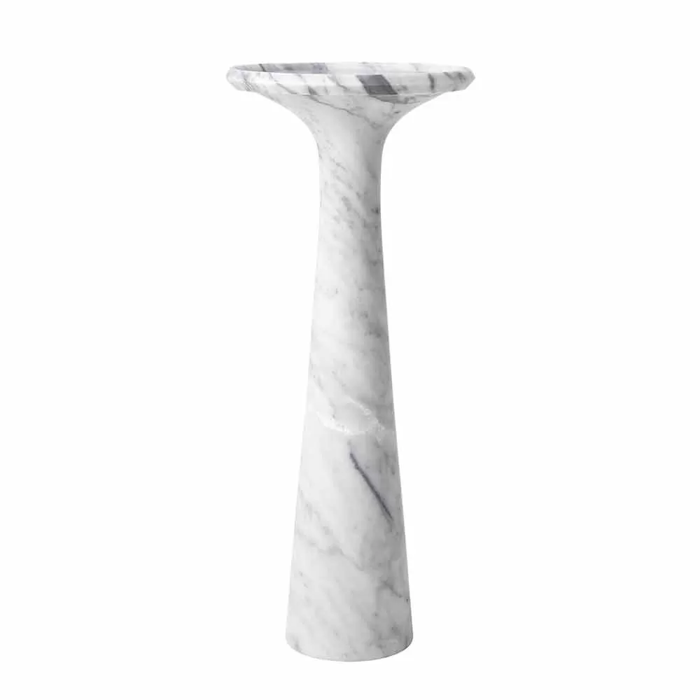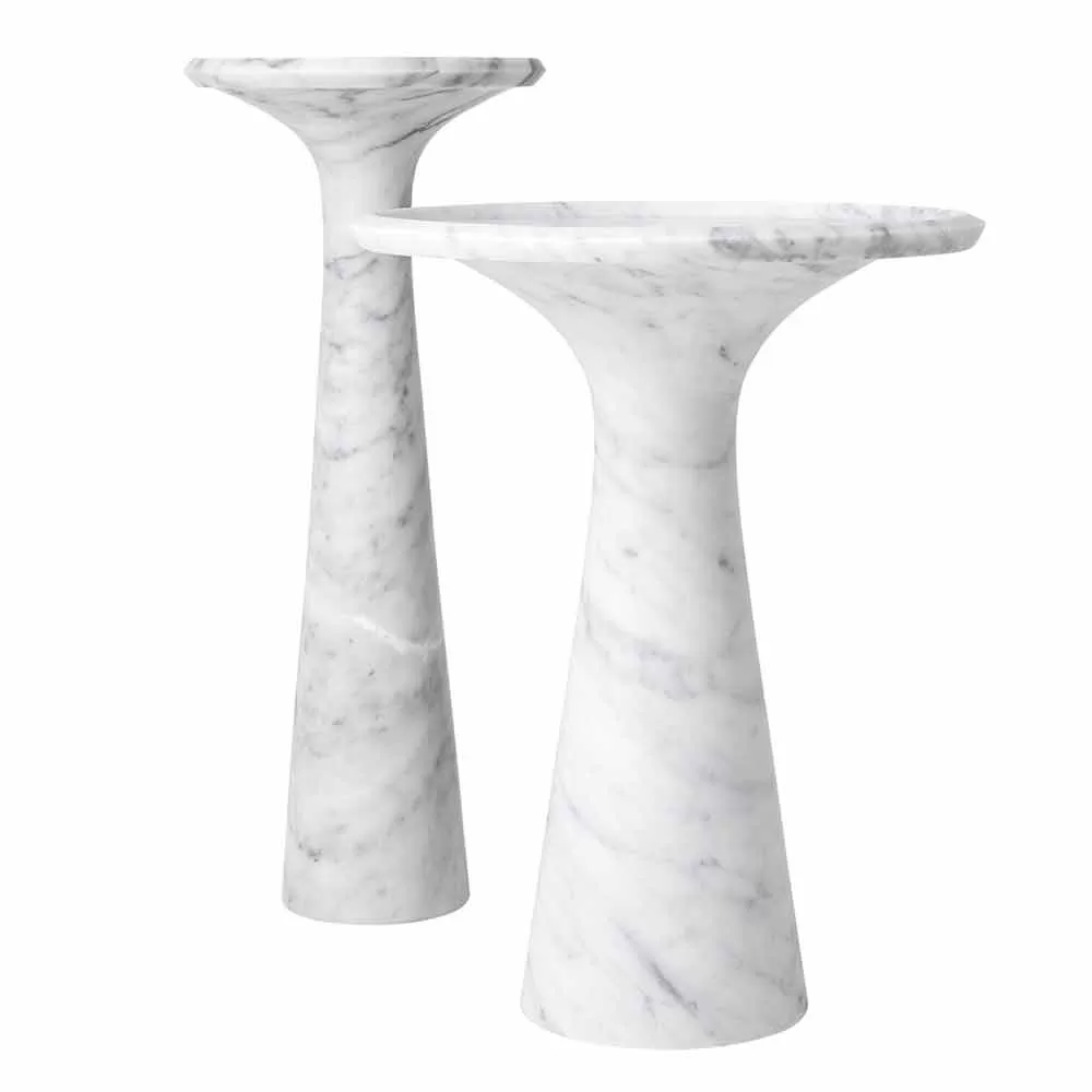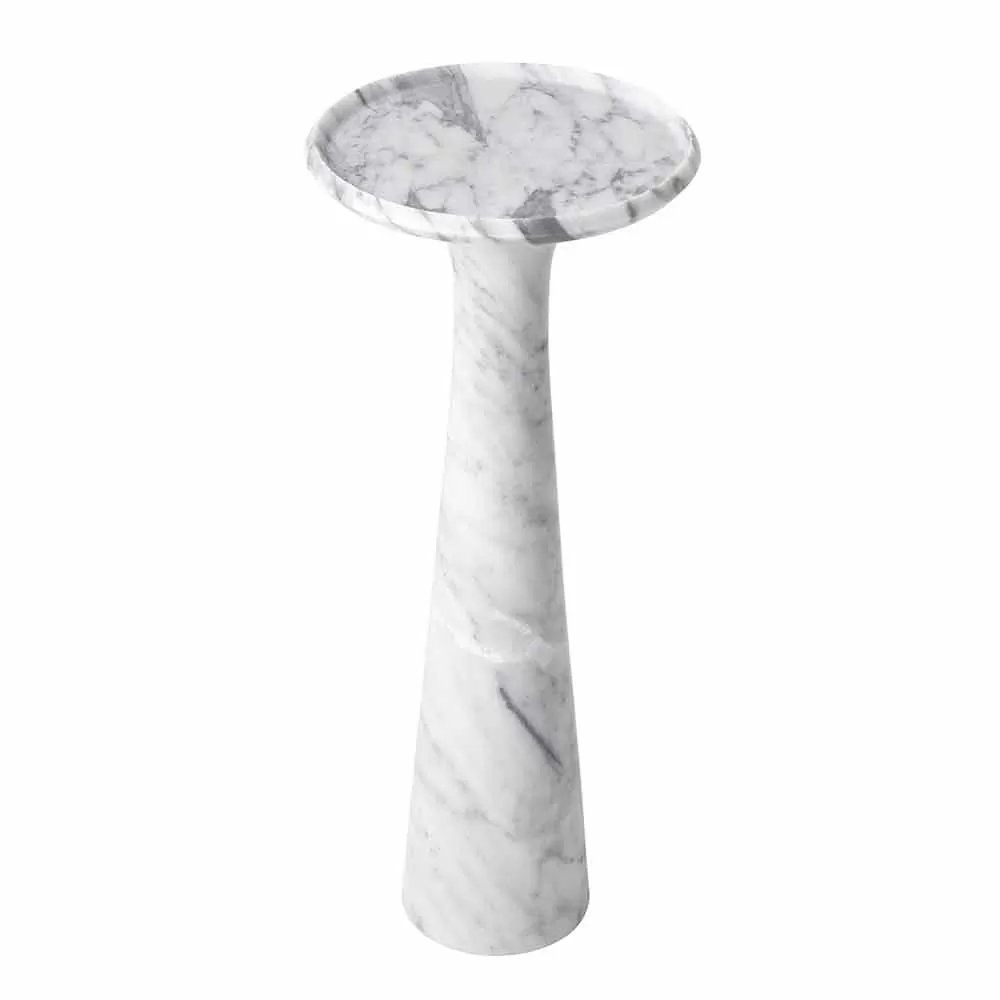 This coffee table has a round top with a raised edge and is entirely made of white Carrara marble, representing a real object of refined design .