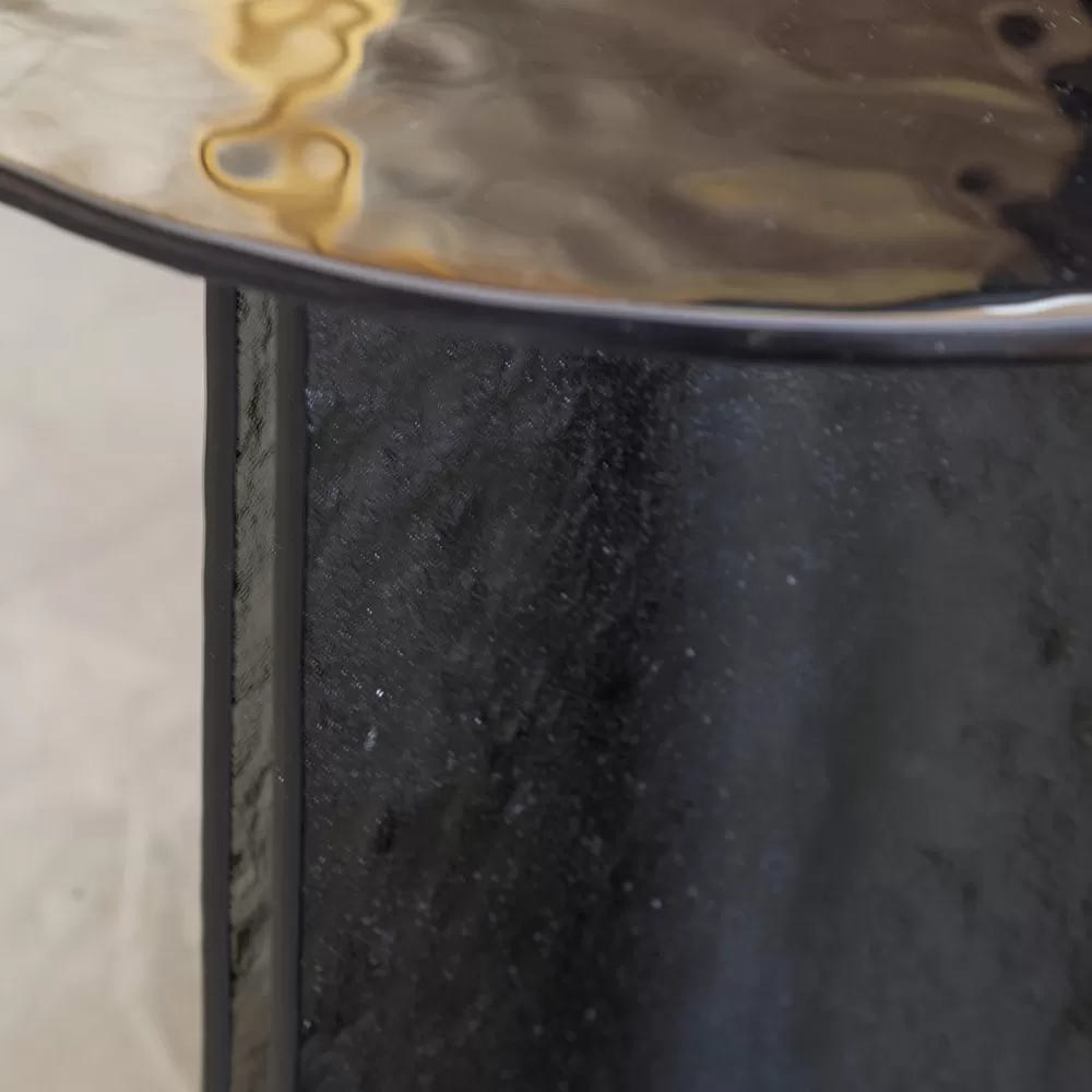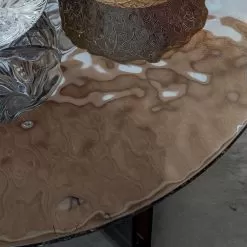 This coffee table  It has a smooth curved glass base and a bush-hammered glass top in a bronze finish with a round design created by the skill of skilled glass craftsmen.