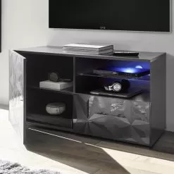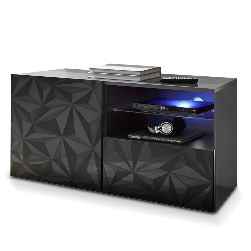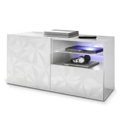 TV stand entirely produced in Italy with melamine-coated chipboard structure complete with 1 or 2 doors and drawer without handles with hinged opening and decorated with elegant geometric screen printing . Â Inside the doors there are practical matching shelves . The sideboard also has an open compartment with a glass shelf . A piece of furniture characterized by an essential and versatile design designed to organize and store the most varied objects of the house such as crockery, kitchen utensils or any other article, thus offering an optimal organization of spaces and at the same time a touch of refined style .