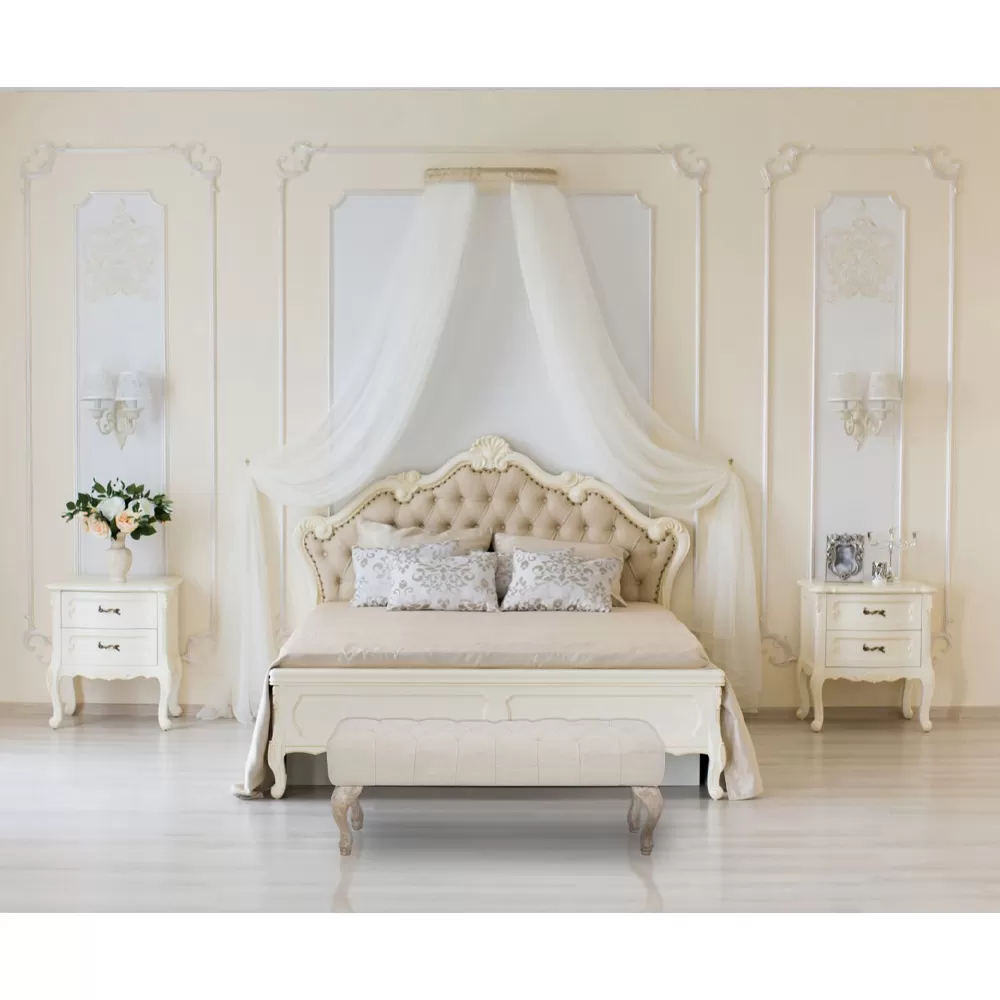 Shabby chic style bench made of wood with padded seat and entirely covered in quilted-effect fabric . A complement with a simple and refined design that enriches domestic spaces such as entrances, living areas but also bedrooms and corridors with an exclusive touch thanks to its elegant personality and its Provencal style .