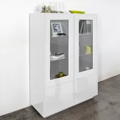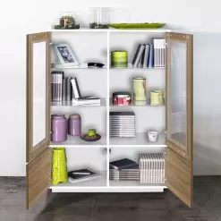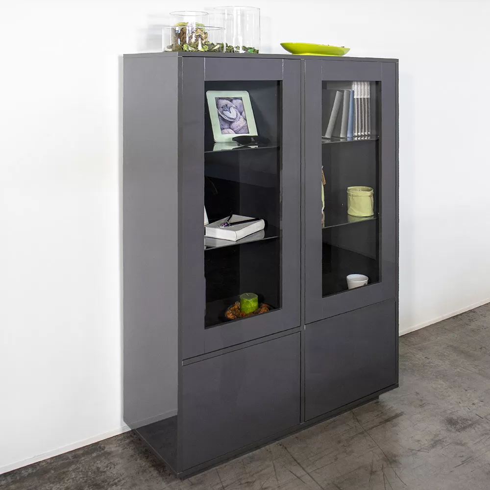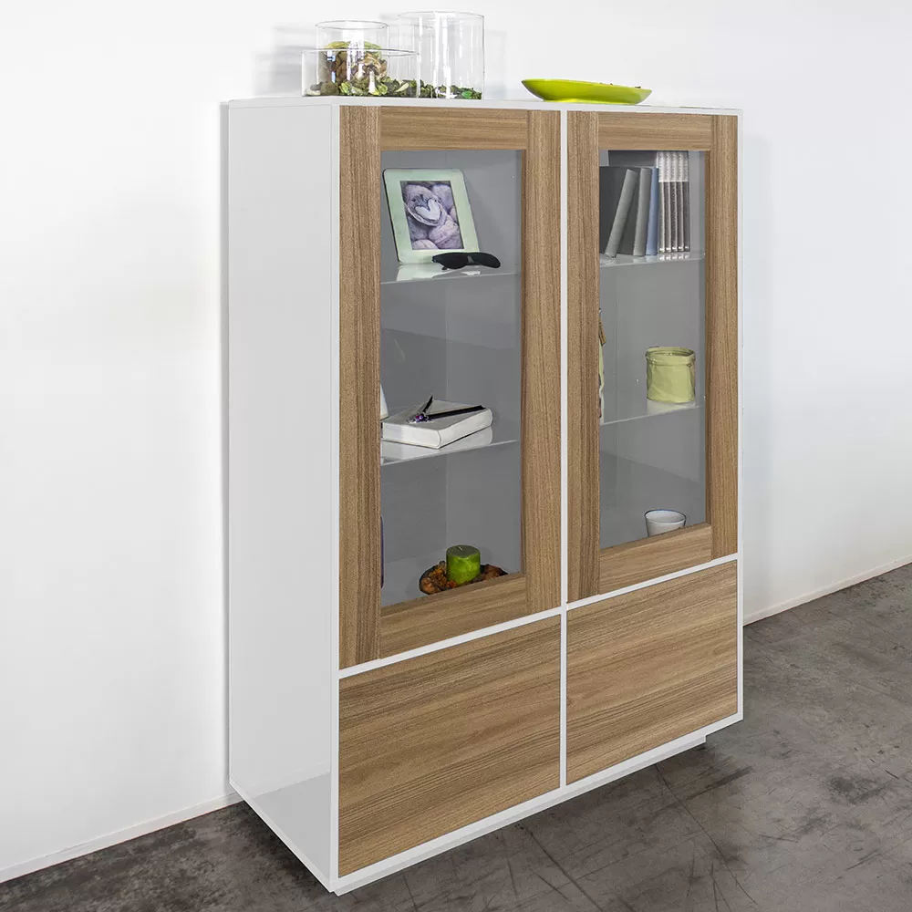 Modern living room or kitchen display cabinet made in Italy in melamine wood with simple but elegant tones composed of double front door with glass panels and internal glass shelves and 2 lower compartments with wooden door that offer an optimal storage space for storing objects varies making the product even more functional . The product has a clean structure without handles that adapts to a great variety of furnishing contexts proving to be particularly versatile while the combination of finishes captures the attention, creating an elegant effect for a simple and interesting play of colors.