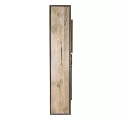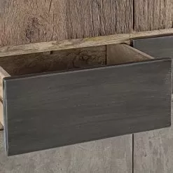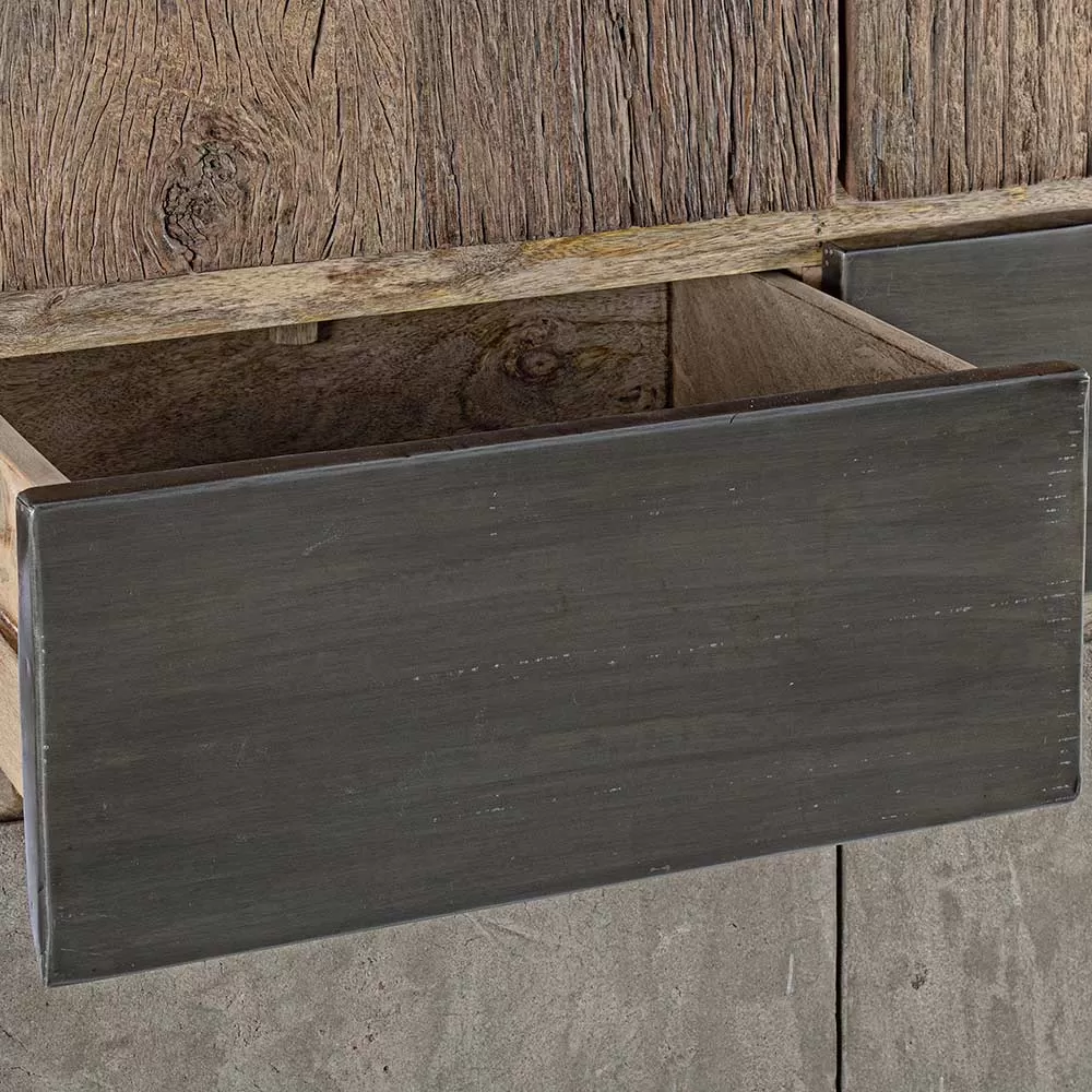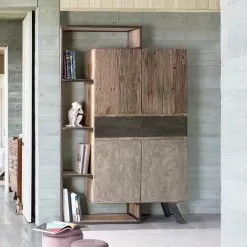 The 4 doors and the 2 drawers are made of recycled wood , steel sheet and cement fiber finish : the peculiarity of the piece of furniture consists precisely in the presence of wooden dowels of different species and colors.