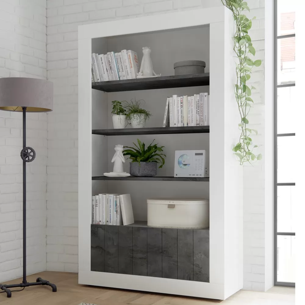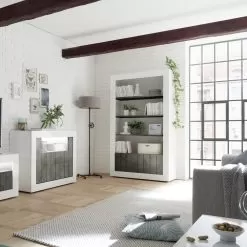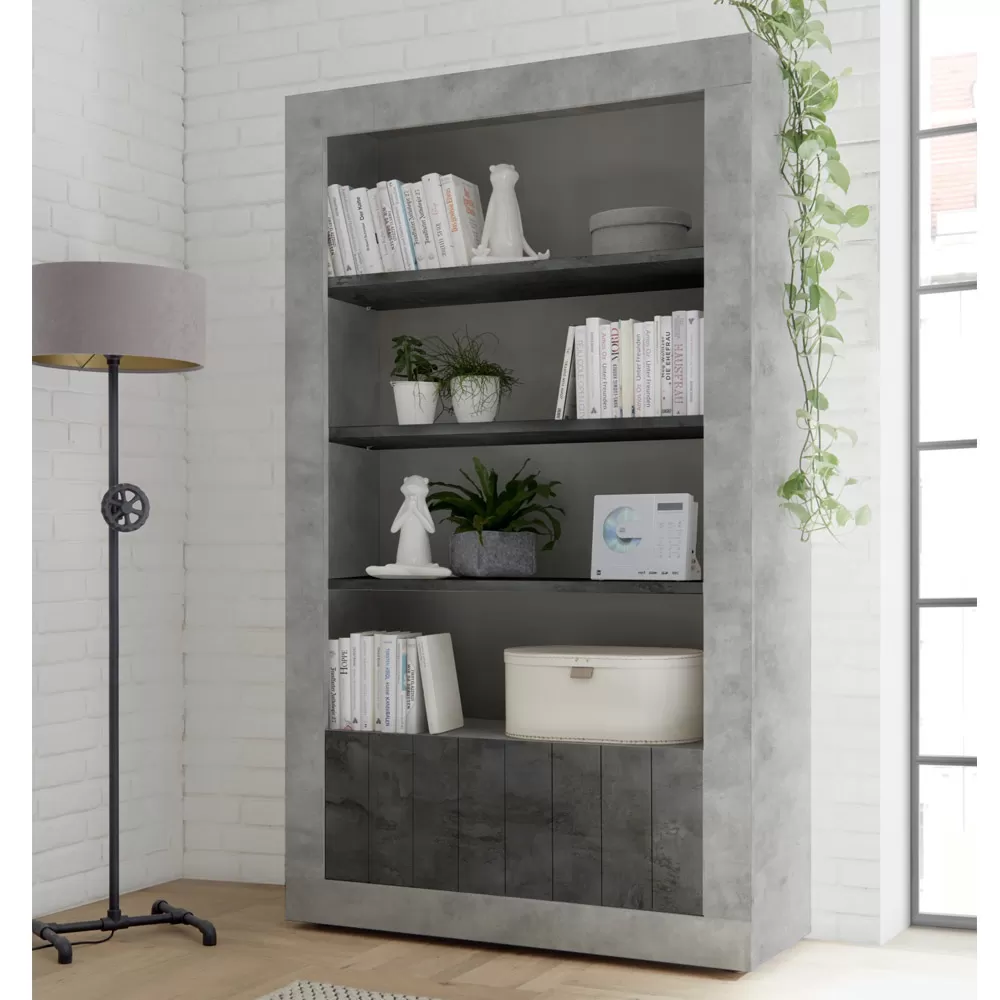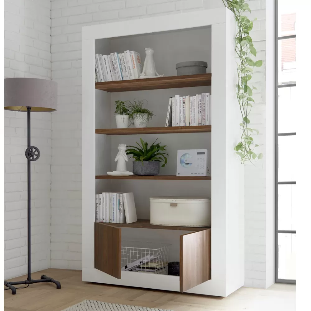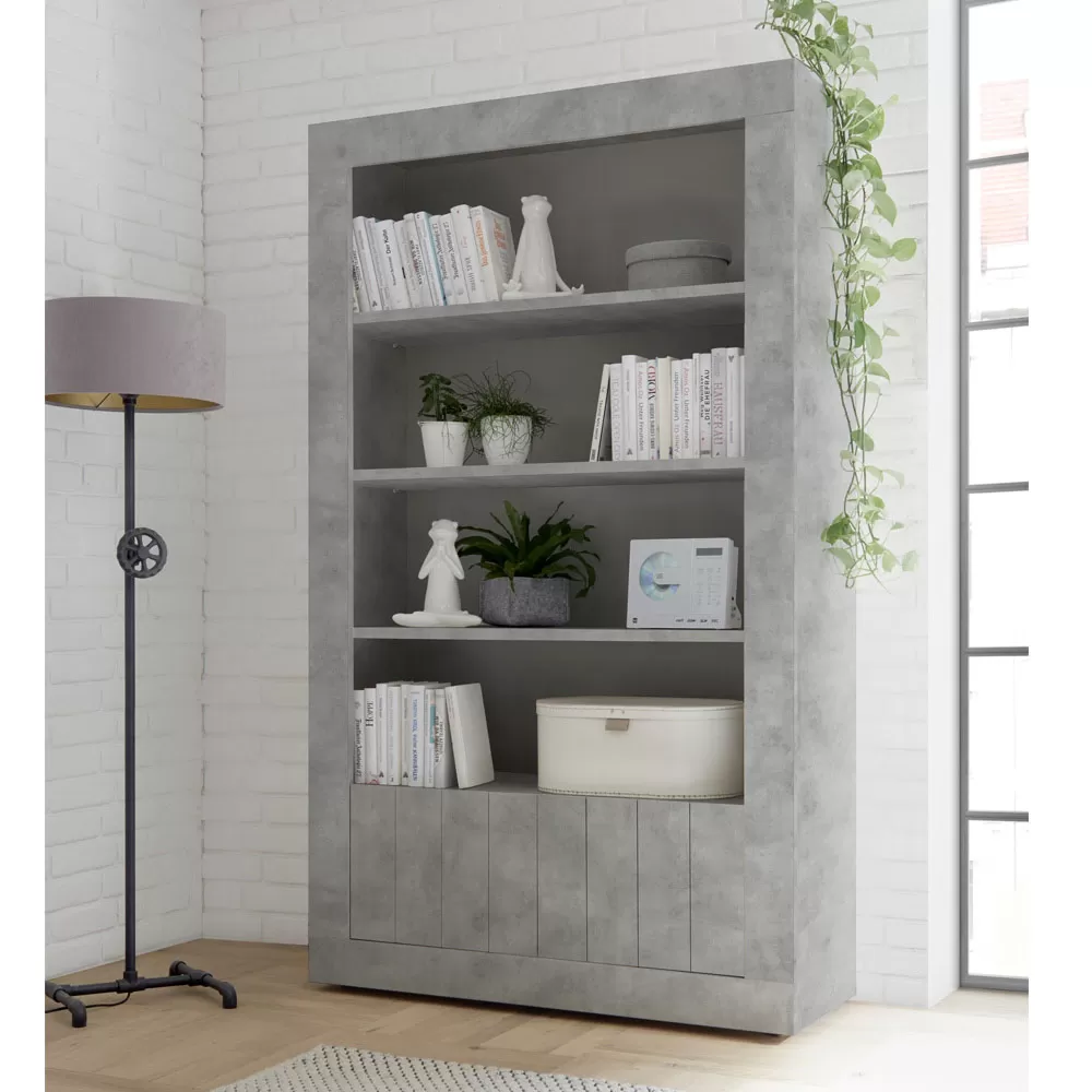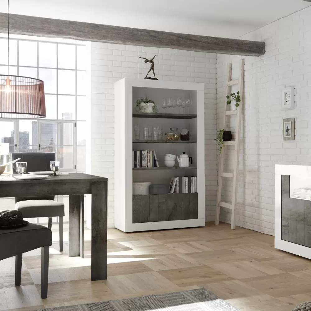 Living room sideboard entirely made in Italy in melamine-coated chipboard with 2 doors with a smooth surface enriched by an original vertical band effect, ideal for optimizing spaces in an orderly manner. There are also 3 visible shelves designed to display knick-knacks, books or any other valuable object that you want to highlight.