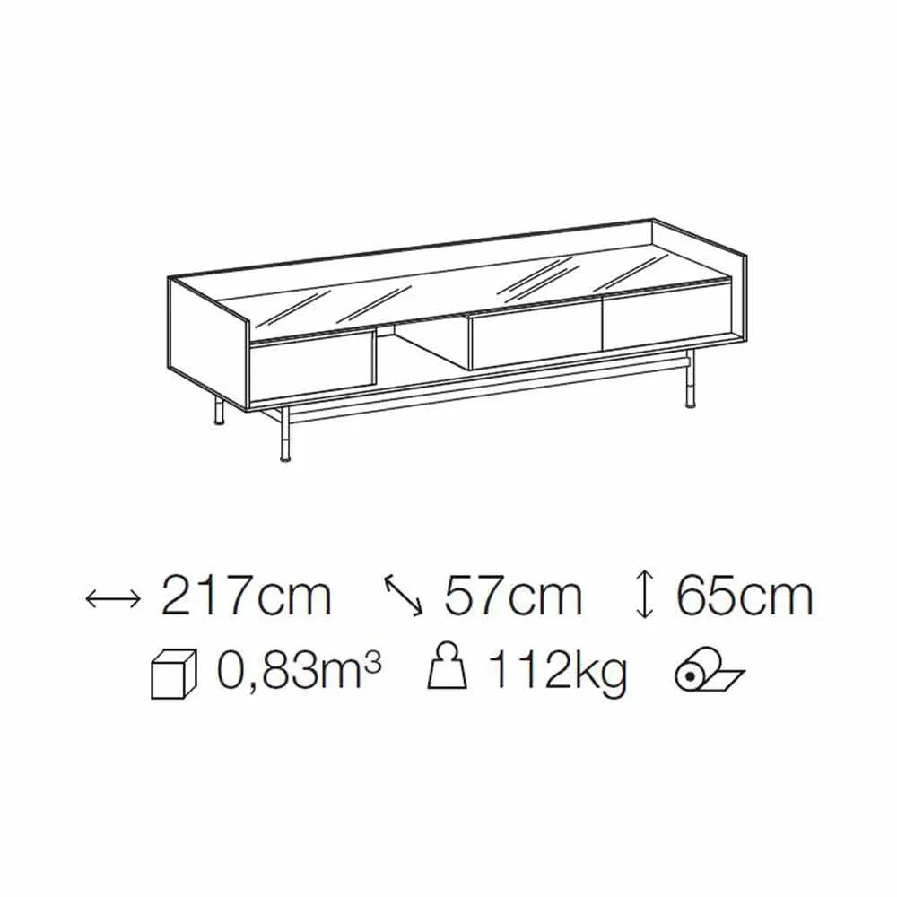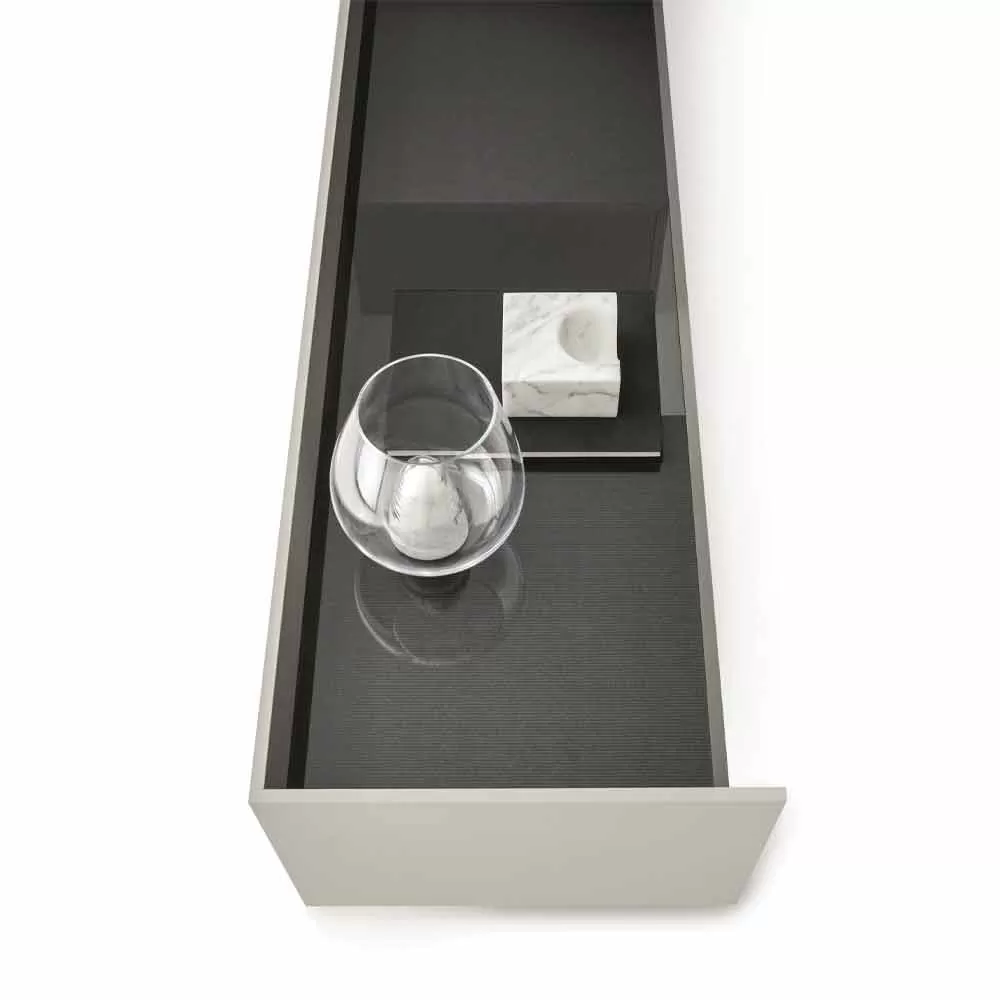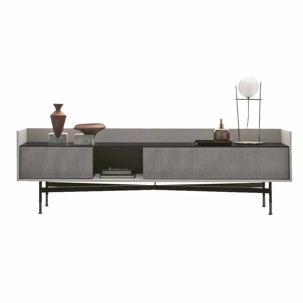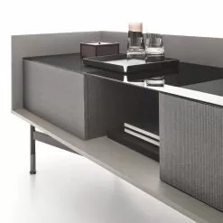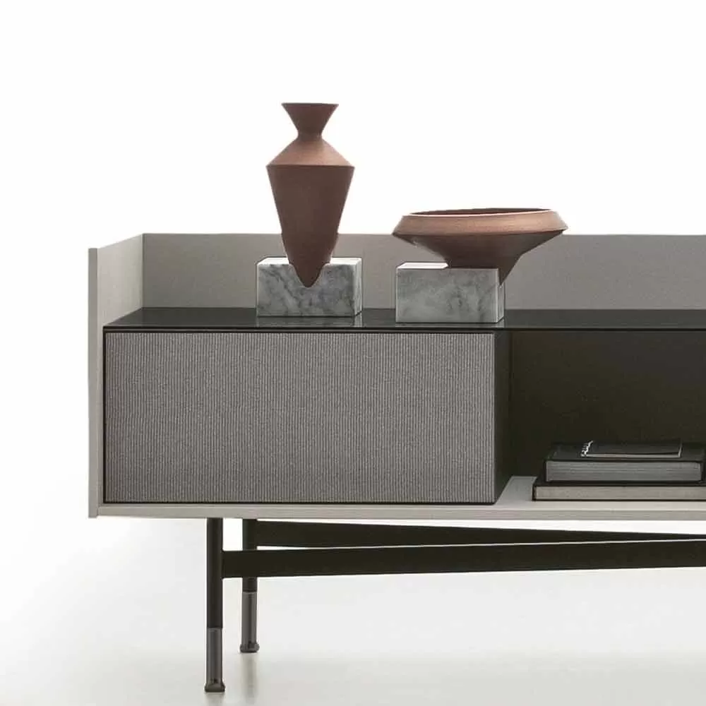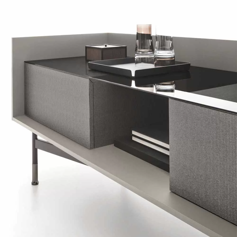 Elegant sideboard made in Italy with lacquered mdf structure in silk gray finish, fronts and internal structure in smoke velvet finish, smoked glass top and anthracite painted metal base with black chrome finish tips. Characterized by a slender design whose functional volume is highlighted by the metal frame, this sideboard has a strong link with the world of textiles represented within its figure through the creative wooden texture that covers the two front elements. Together with this peculiarity, the elegant smoked finish top is also highlighted, which increases its refined aesthetics and timeless charm.