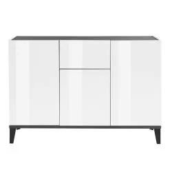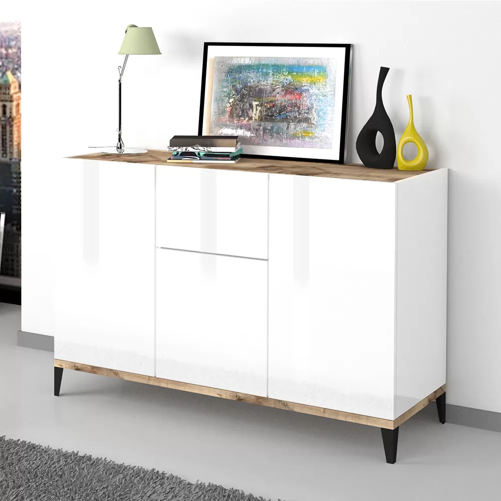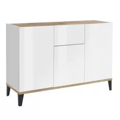 It is a piece of furniture with a minimal design that combines an elegant aesthetic with a wide usefulness . The white or wood finish front, combined with the two finishes that cover the top and bottom of the product, captures the attention, creating a chic and elegant effect for a simple and interesting play of colors.