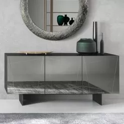 Sideboard entirely made in Italy with melamine structure, 3 MDF doors with a practical shelf inside each, covered in mirror- effect glass with geomatic decoration  and base or feet in black painted metal . A simple and essential design but at the same time with a strong visual impact and with an unprecedented elegance designed for any area of the house in which it plays a functional role allowing you to organize any object inside it but at the same time a decorative role as it completes the furnishing in an original and refined way thanks to its modern and imposing personality .