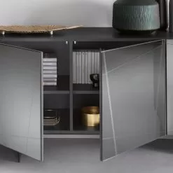 The marvelous doors in mirror finish enrich the aesthetics of the product by giving light and brilliance to the entire room while the creative decoration with geometric lines that characterizes the surface is fundamental to create a sense of dynamism, making the rigorous shape of the sideboard more gentle.