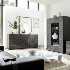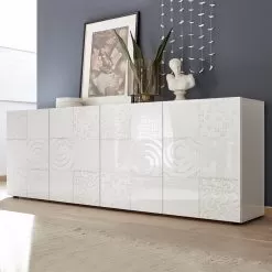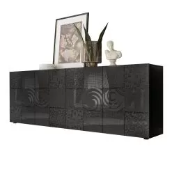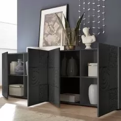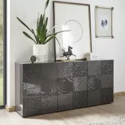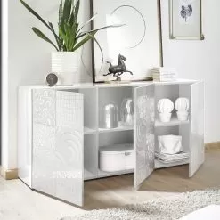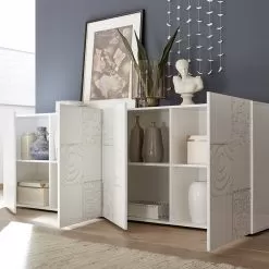 Living room sideboard made of agglomerated wood covered with melamine with doors without handles with hinged opening decorated with elegant three-dimensional screen printing inside which there are practical matching shelves . A piece of furniture that comes from a 100% Made in Italy production characterized by a refined and contemporary design capable of enriching the most varied areas of the house with an exclusive and refined touch .