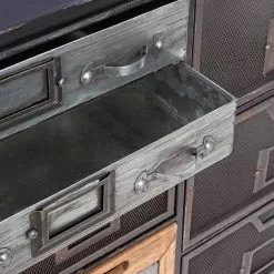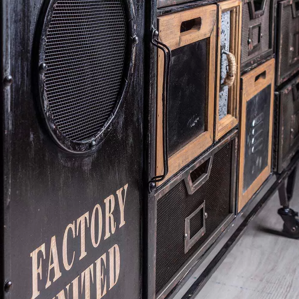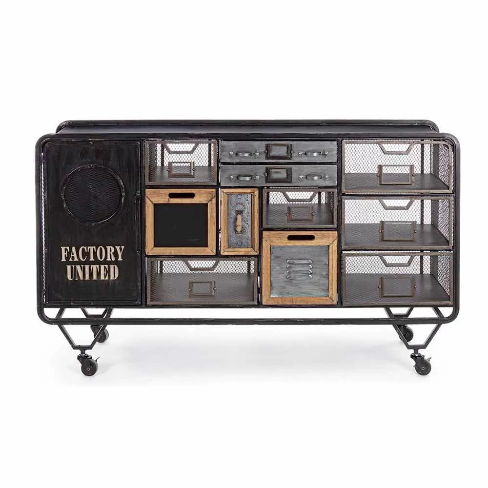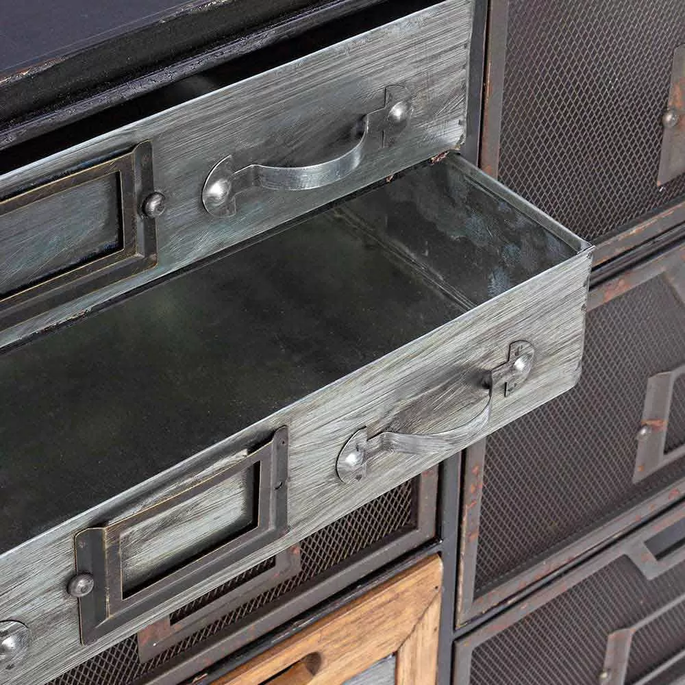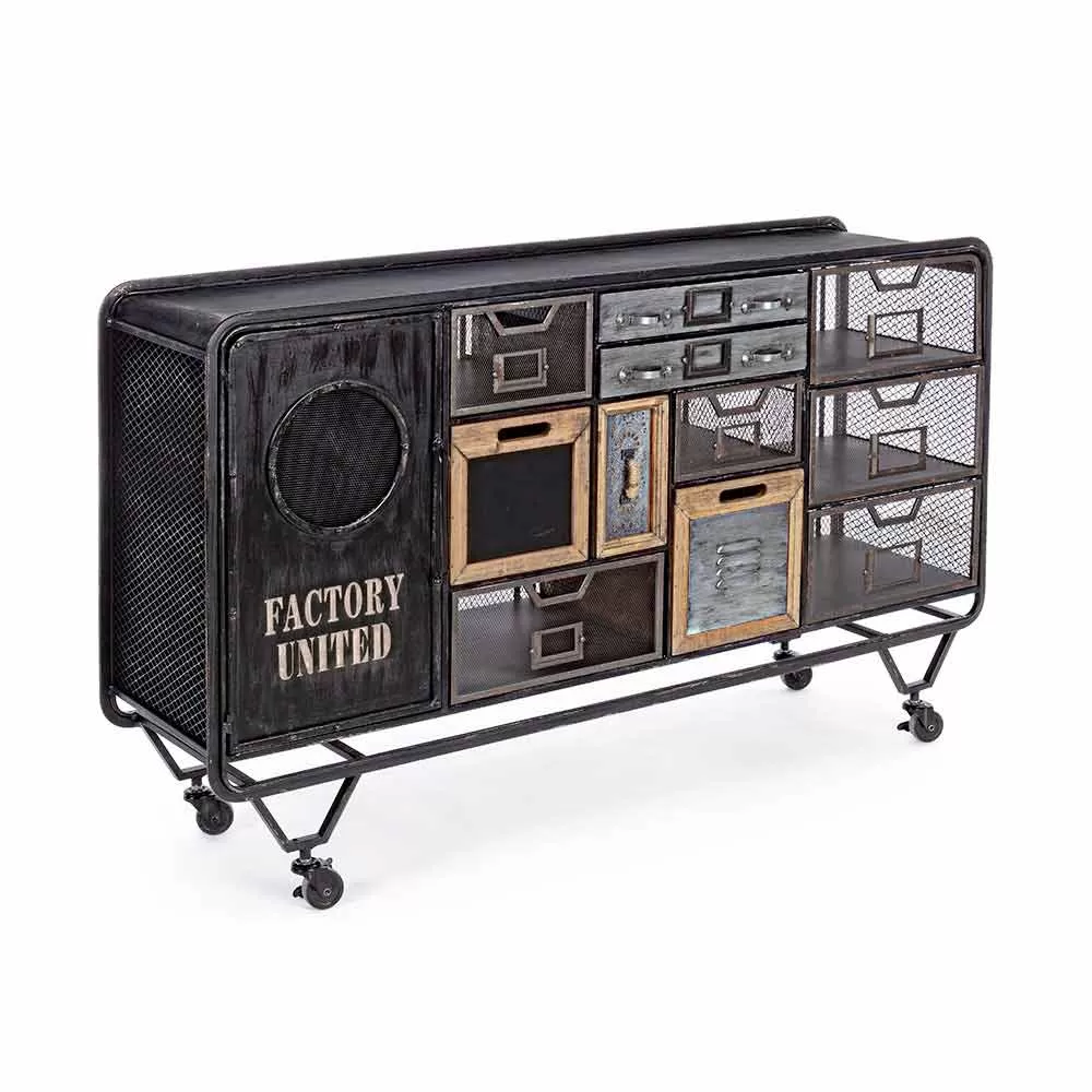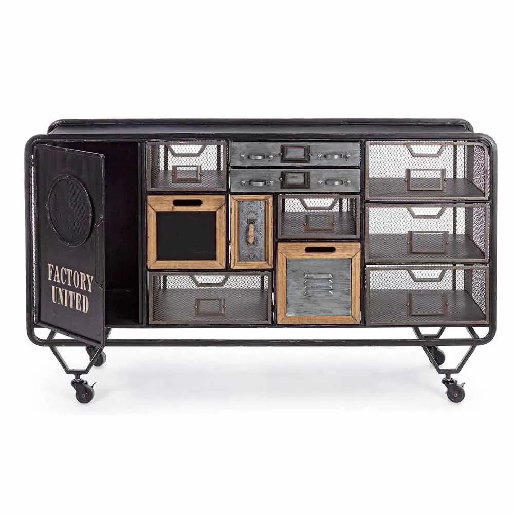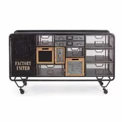 Steel structure , epoxy powder coating. Drawers in steel , zinc and pine wood . Plastic wheels.
