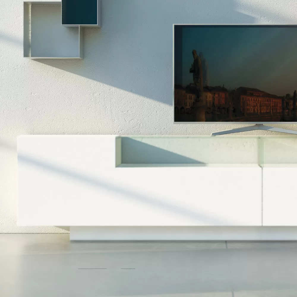 Living room sideboard with white matt lacquered MDF structure composed of 2 flap doors  which guarantee great functionality and practicality. The glass case and plinth are included. This product is full of taste and design thanks to its elegant and refined finishes.  The various materials used for the construction offer great quality and resistance over time, giving the product that unique and unforgettable touch.