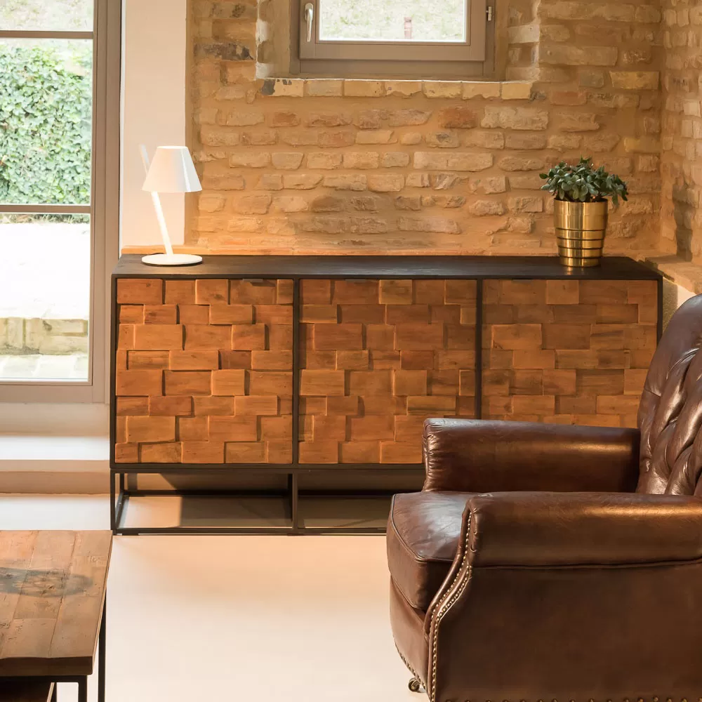 Indoor sideboard made of natural coffee colored recycled wood with 3 front doors in patchwork wood and body in brushed black metal.