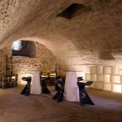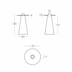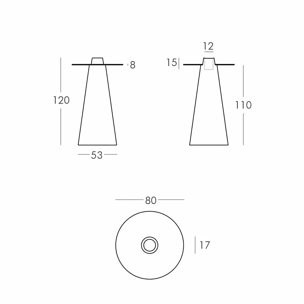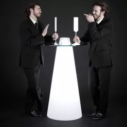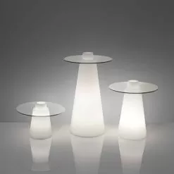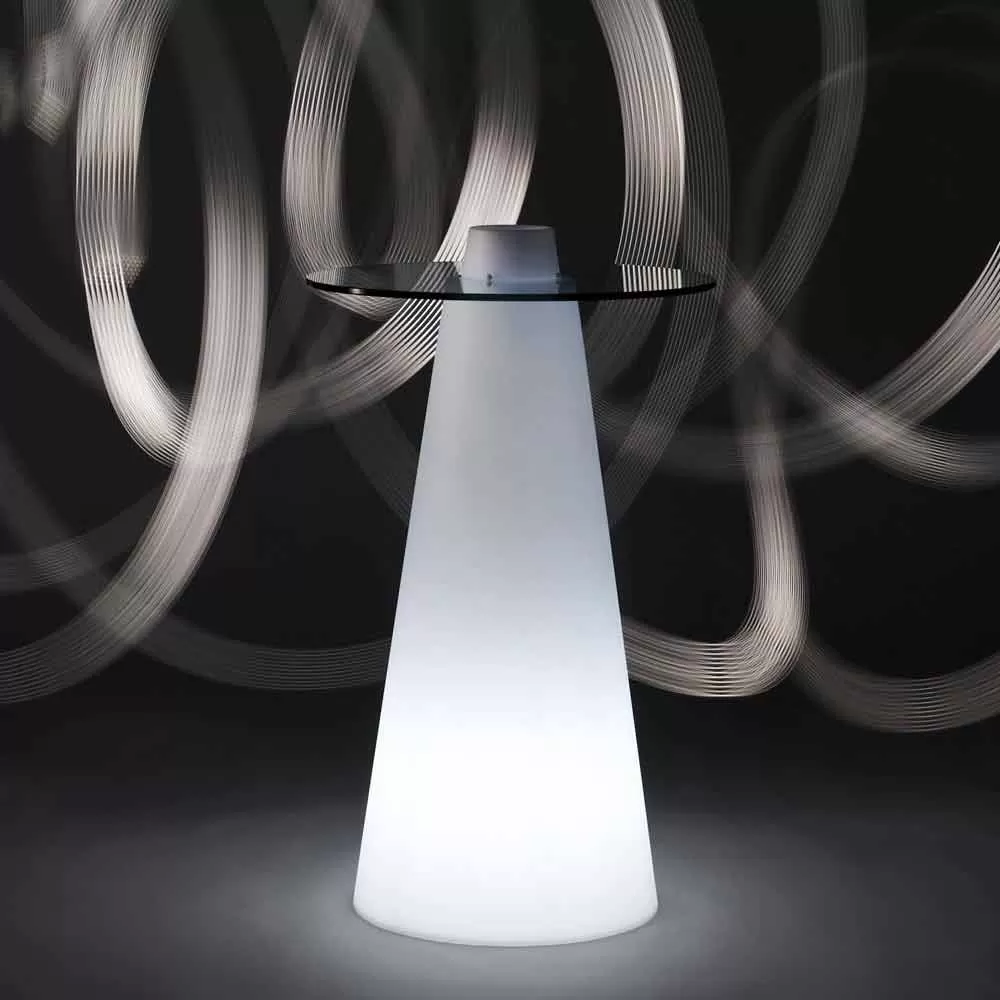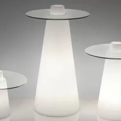 It consists of a conical polyethylene base and a circular tempered glass top. Not indifferent particularity is the central bottle compartment, a detail that can make the difference on special occasions.