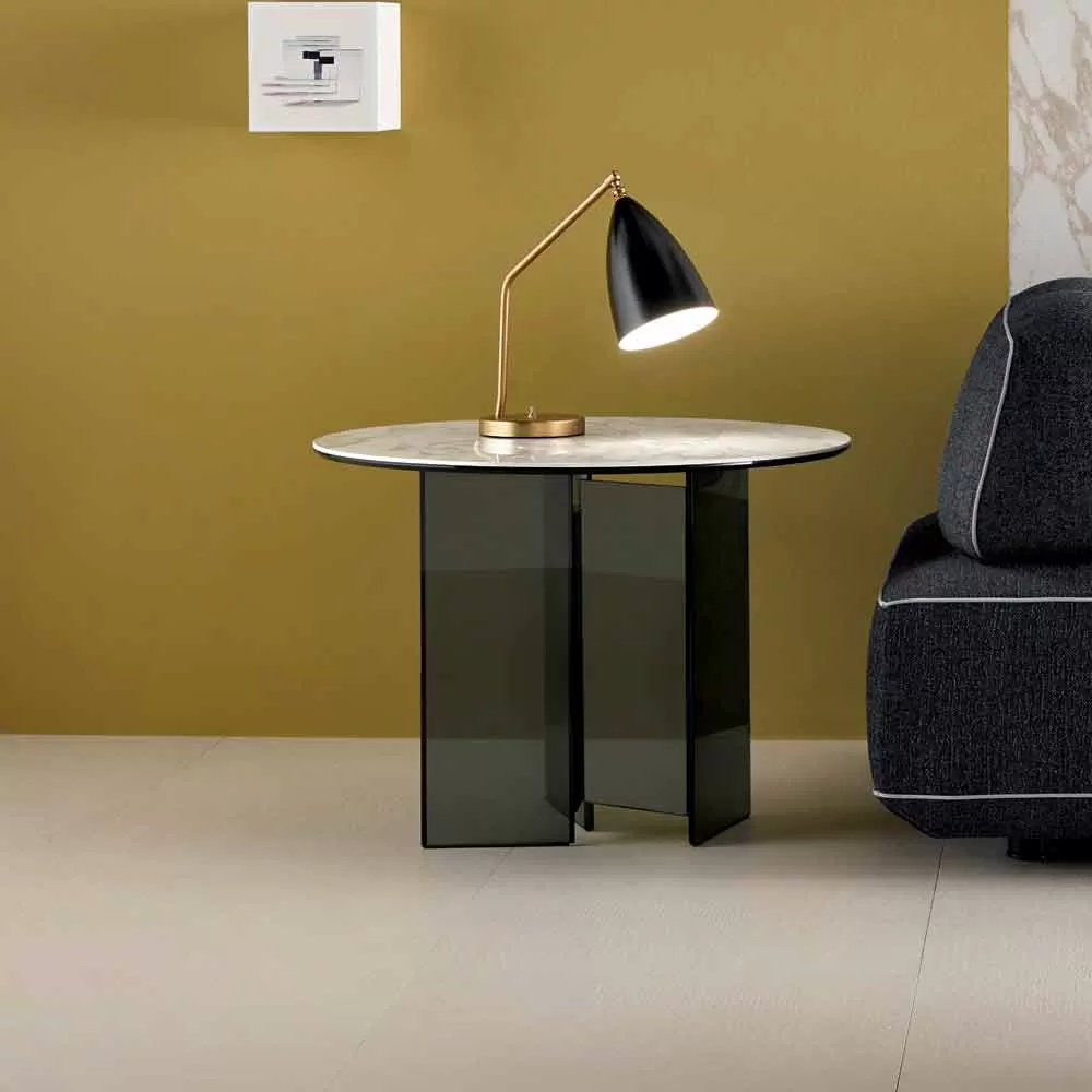 Round sofa side table with ceramic top and smoked glass legs made in Italy.