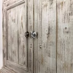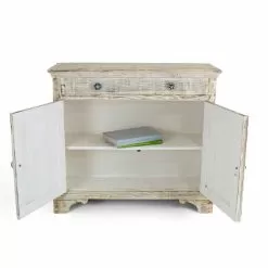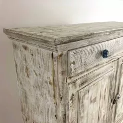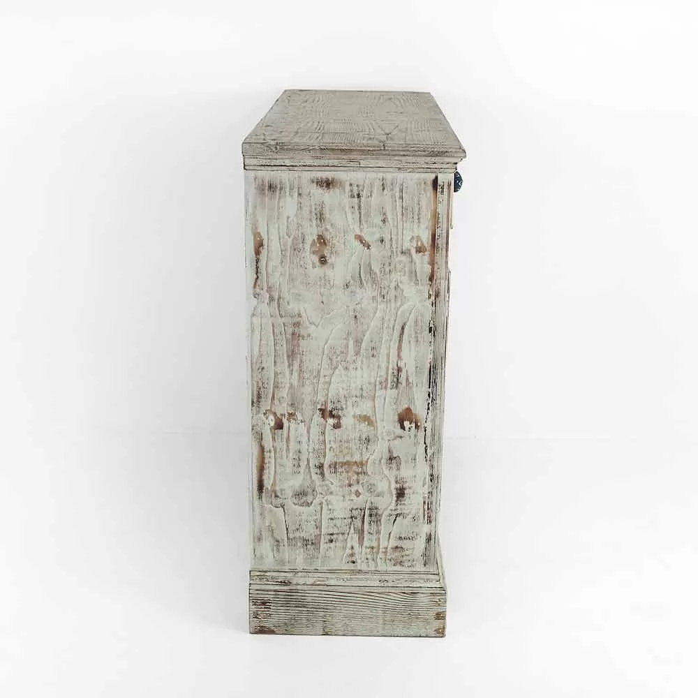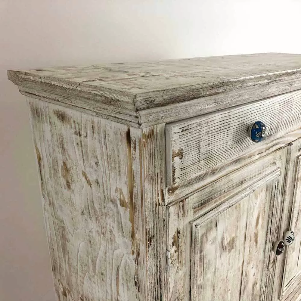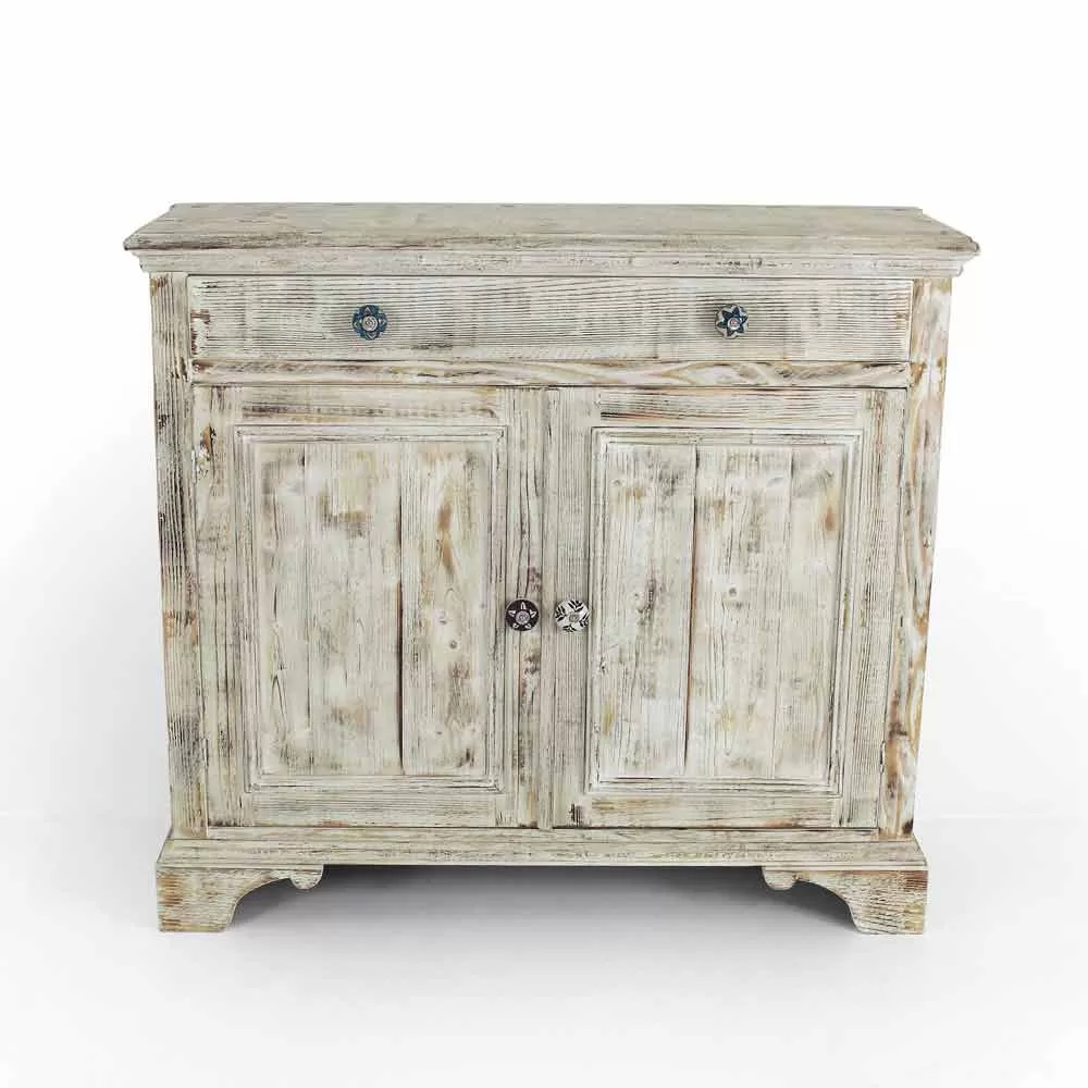 Sideboard in solid fir wood entirely handmade in Italy and characterized by the wonderful flame-burned flayed finish which highlights the particular grain of the wood that makes the product unique. The sideboard is then finished with an aged white paint and completed with the transparent finish that makes it water-repellent and fixes the colors to make them unchangeable over time. Its structure includes 2 doors with internal shelf and 1 drawer with poplar plywood bottom which are completed with special hand-painted ceramic knobs allowing you to have perfectly organized spaces.