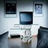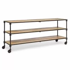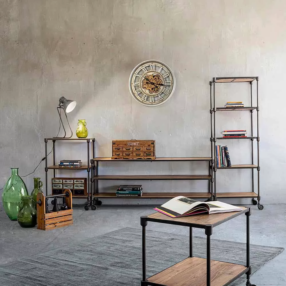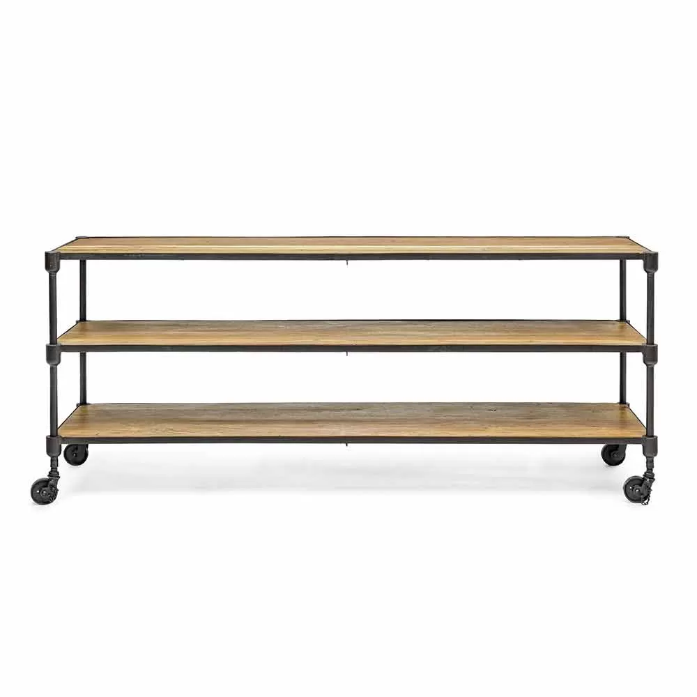Steel structure painted with epoxy powder. Shelves in recycled teak wood with a water-based finish. Steel wheels.