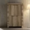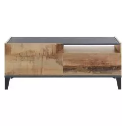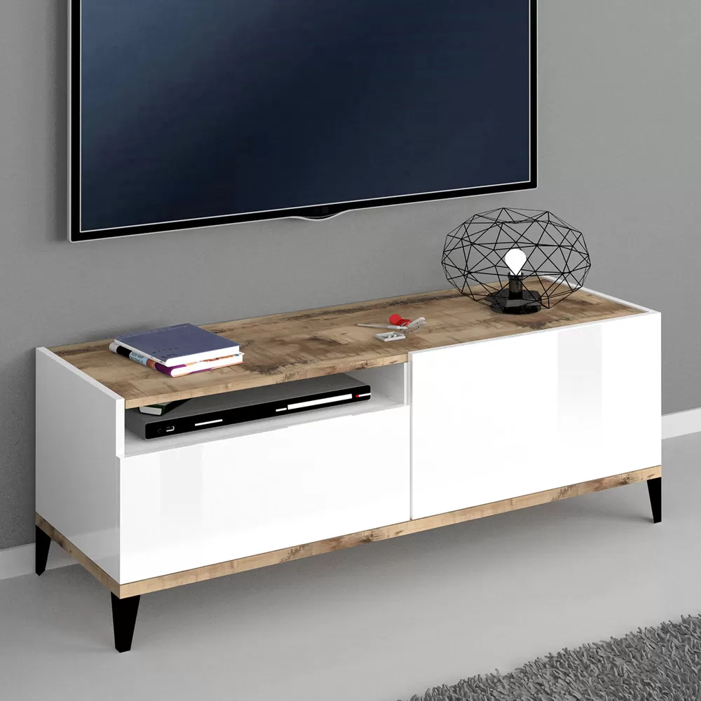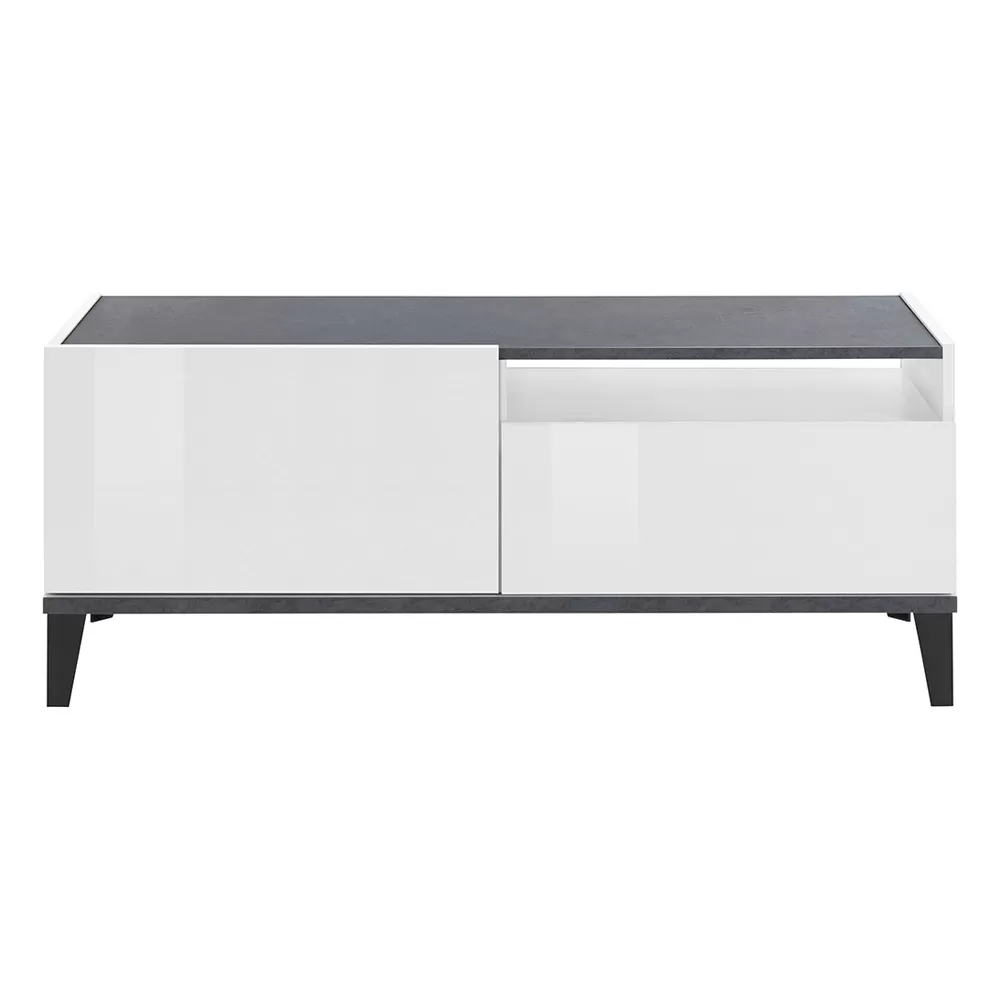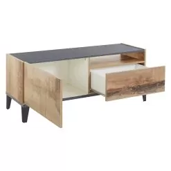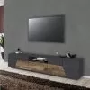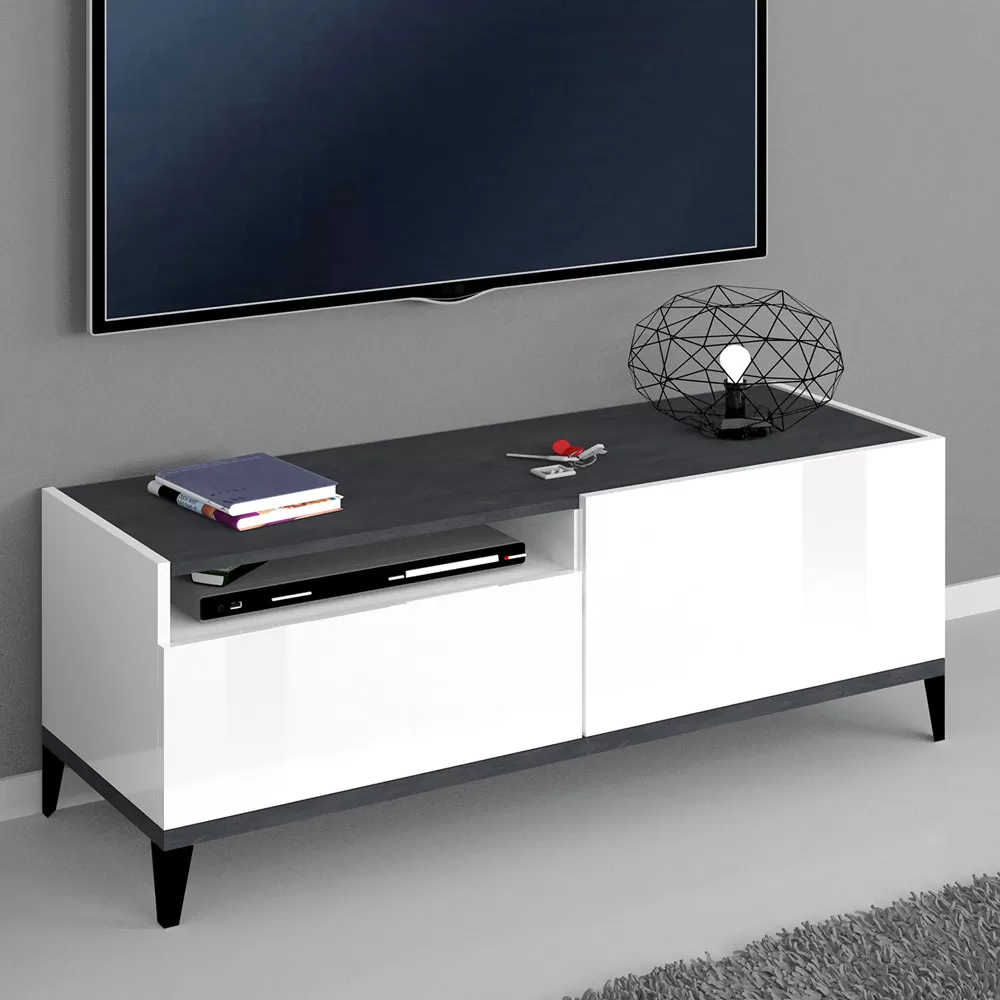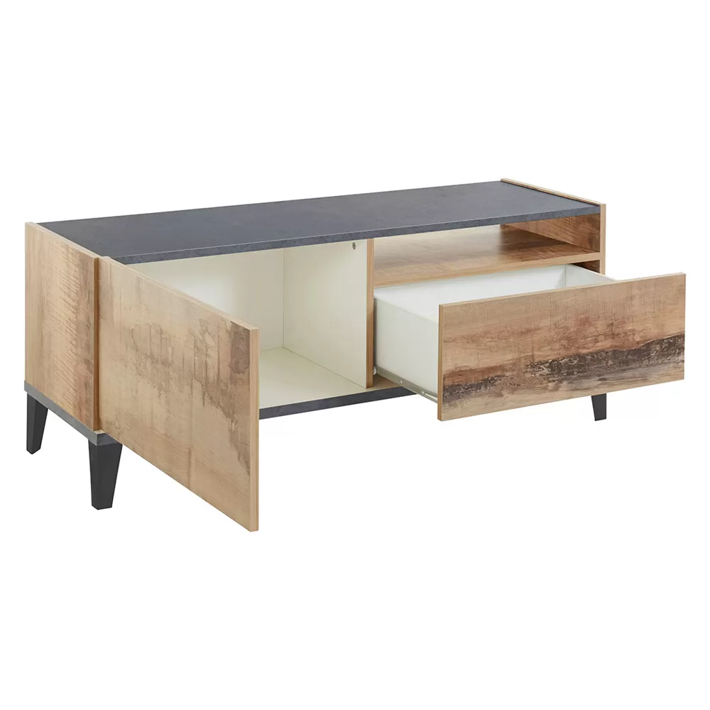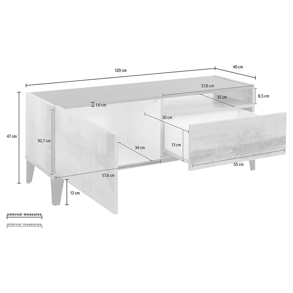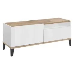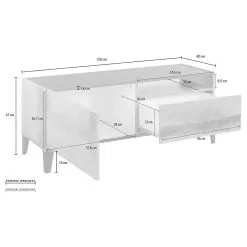 Top and bottom of the cabinet are in slate or wood effect finish and create a pleasant contrast with the rest of the product for a simple and interesting play of colors. It is a piece of furniture with a minimal design that combines an elegant aesthetic with a wide usefulness. This TV cabinet fits perfectly into any living room, creating perfect harmony with the surrounding elements.