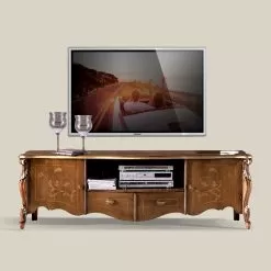 Classic style TV stand for living room complete with 2 doors, 2 drawers and 1 compartment made of Bassano walnut finish wood with antique gold details. A unique and refined complement, completely made in Italy by skilled master craftsmen , masters of art who finish each complement with wisdom and taste for elegance. The production is carried out using fine materials , and performing the work by hand with the utmost care and professionalism that distinguishes Made in Italy products.