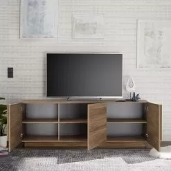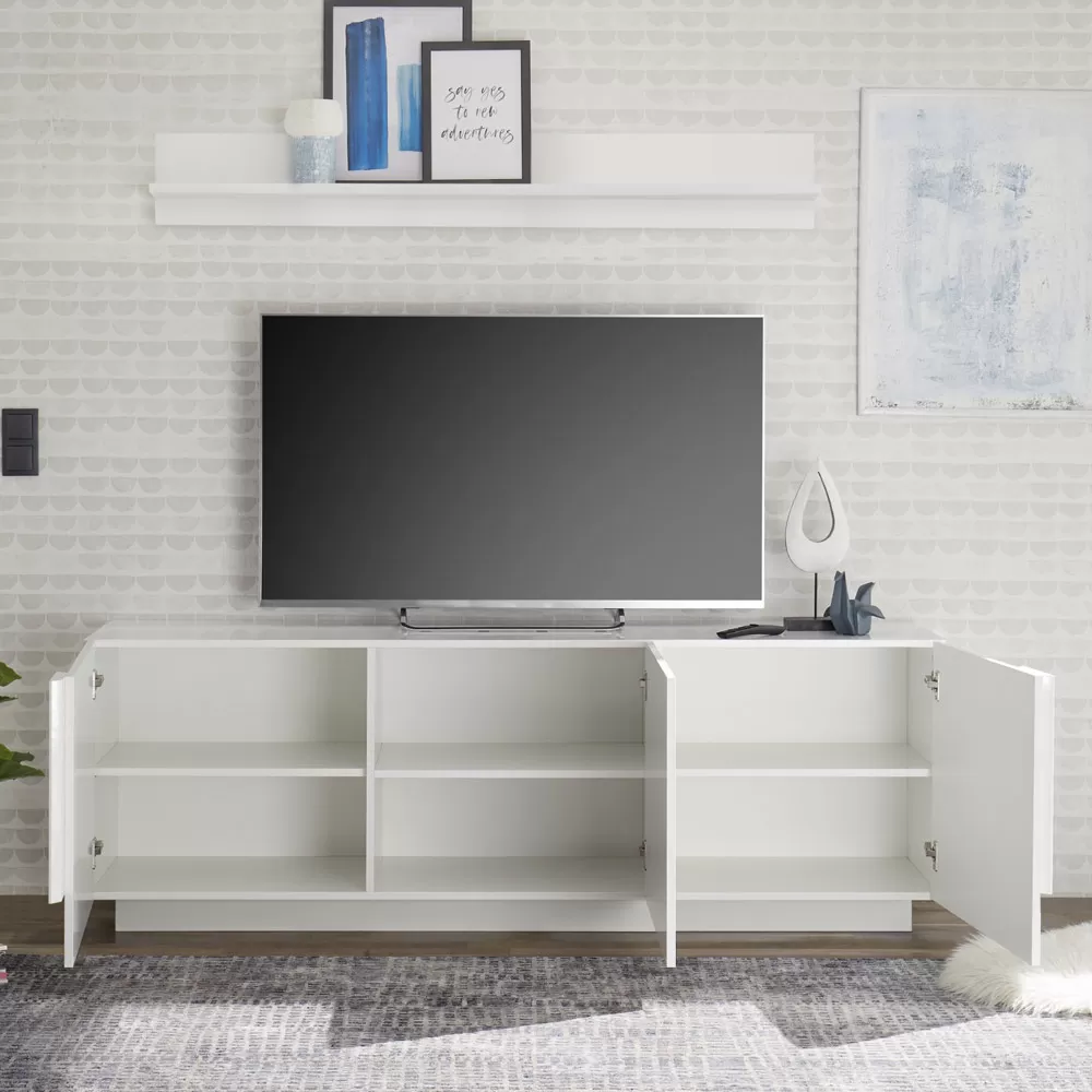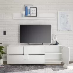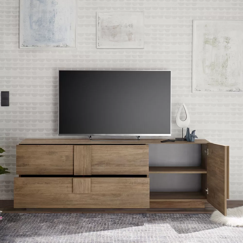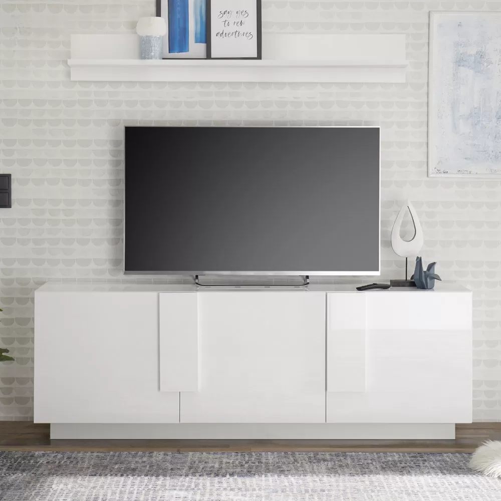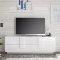 TV stand entirely made in Italy in melamine-coated chipboard equipped with metal guides and cushioned hinges . A piece of furniture with modern and captivating lines characterized by unique details that make it sophisticated and original . The choice of colors proposed is designed to best interpret the union between elegance and minimalism and to be inspired by a contemporary aesthetic designed to meet the desires and needs of those who do not want to give up on style and quality in furnishing.
