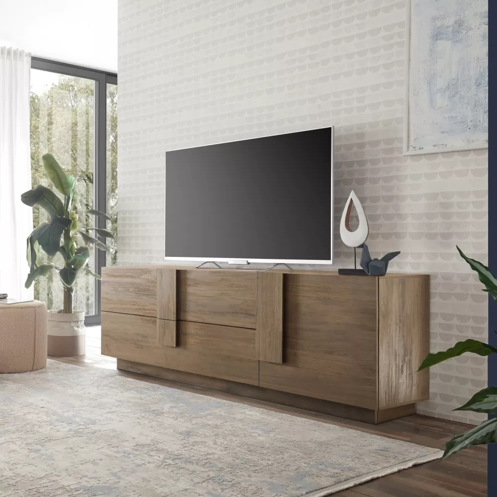 The relief details that characterize the essential design of the TV cabinet are the real strong point of the product, managing to enrich the surrounding environment with personality and character and proving to be particularly useful for opening the doors and drawers inside which it is possible organize the most varied objects thus maintaining order within the room.