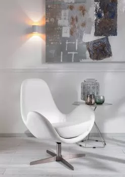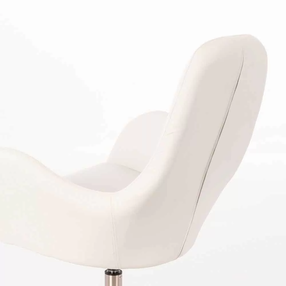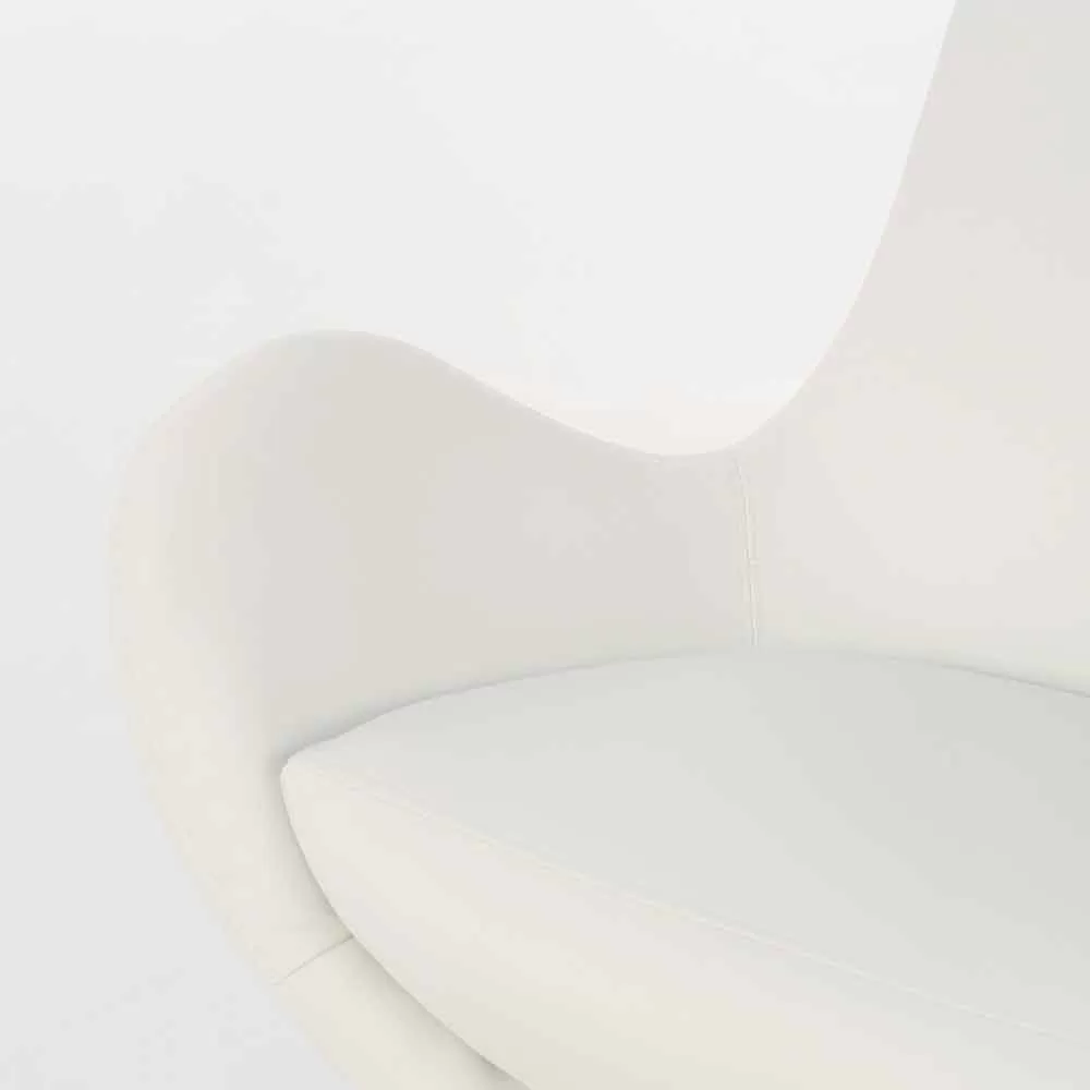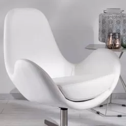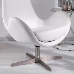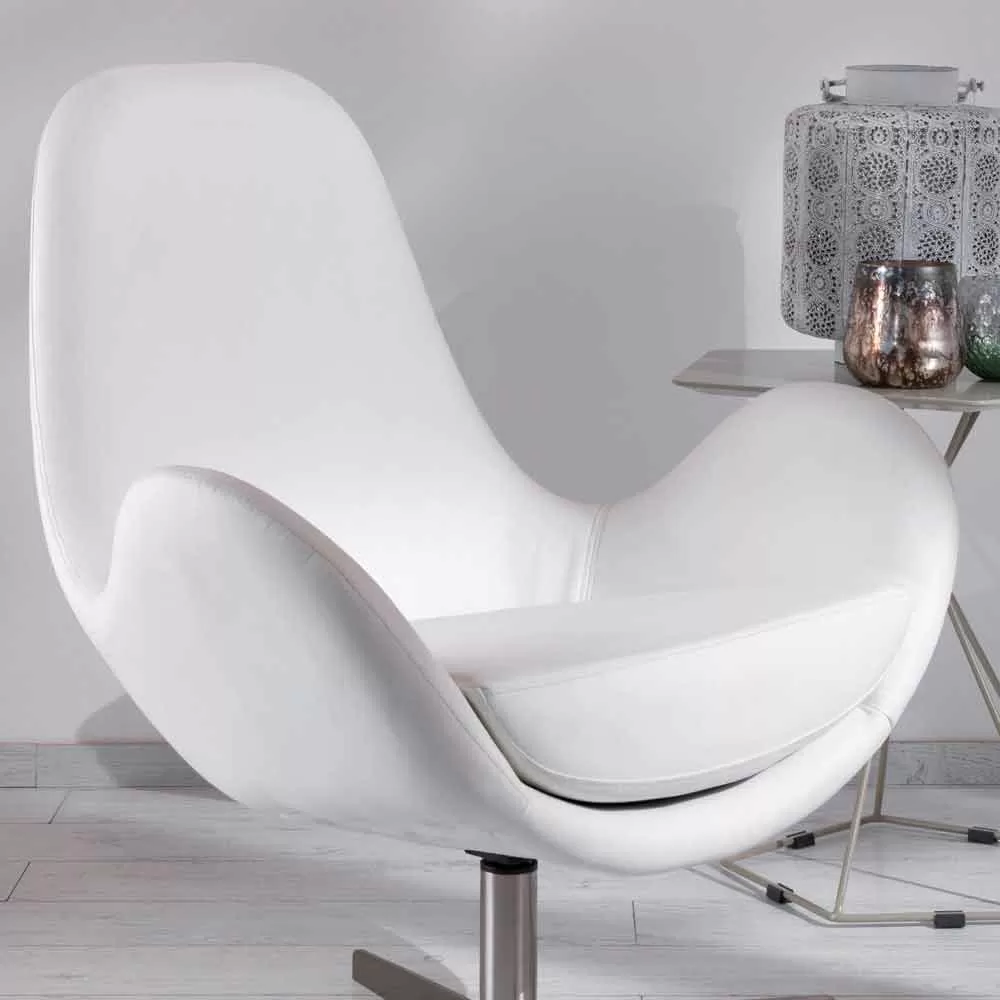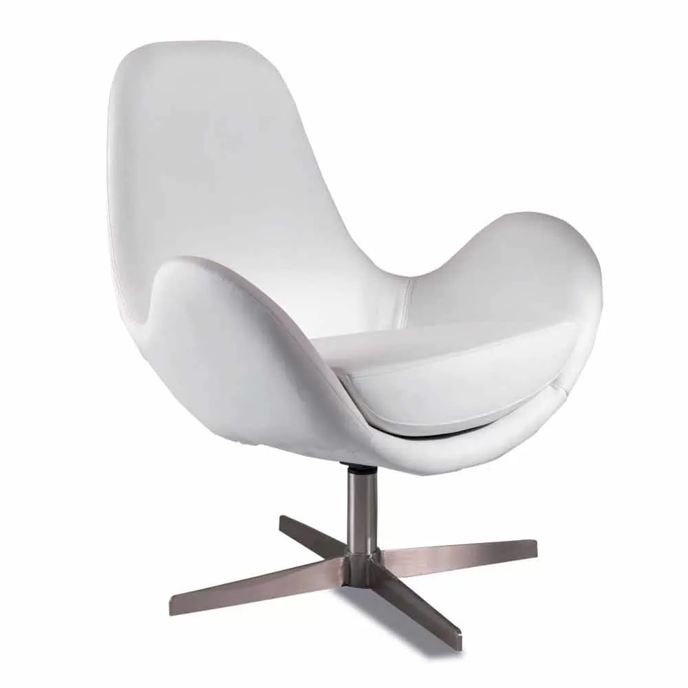 Modern upholstered swivel armchair for living room with leatherette seat and chrome metal base.