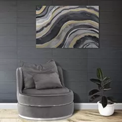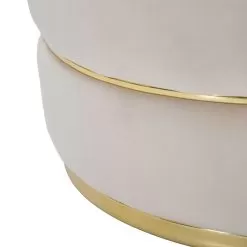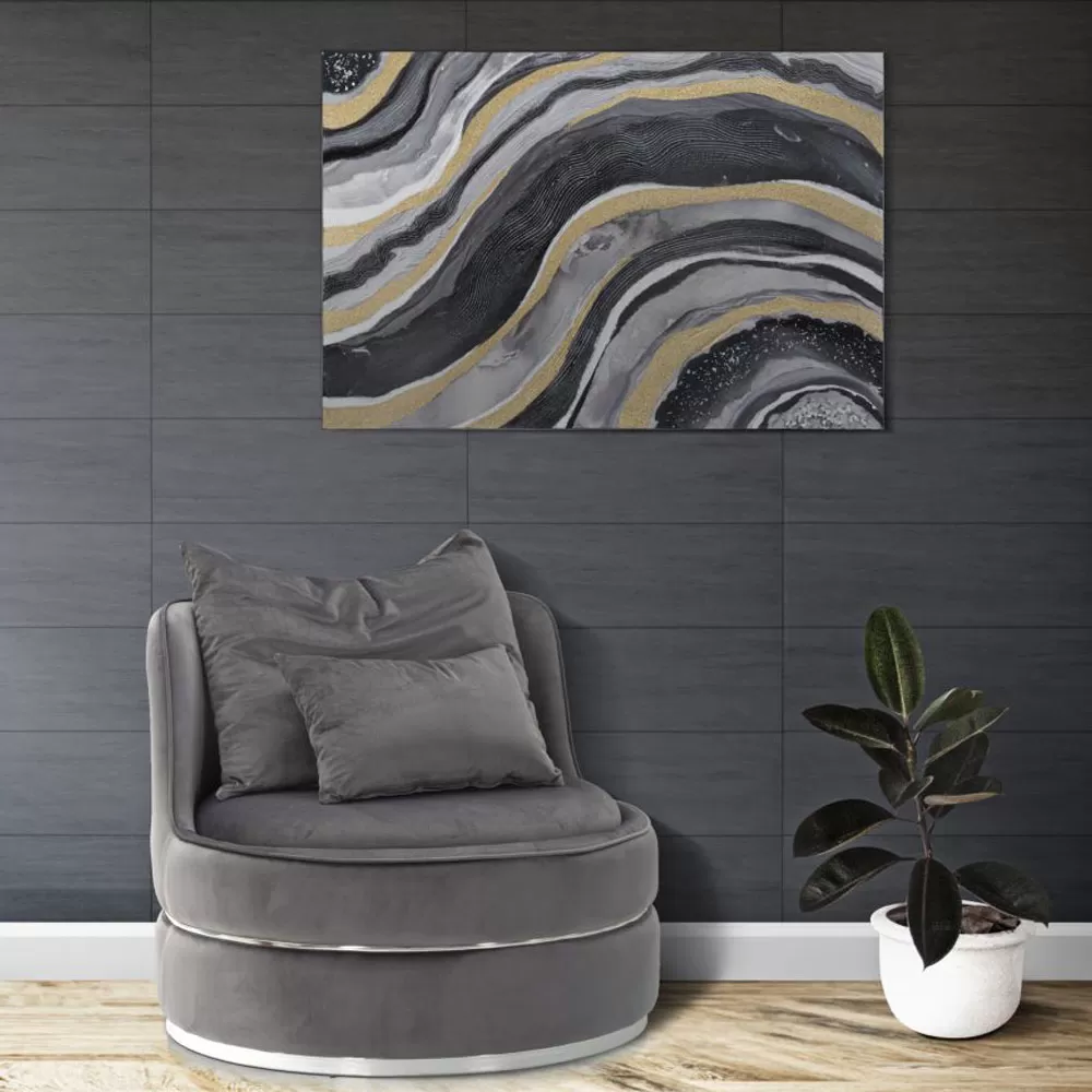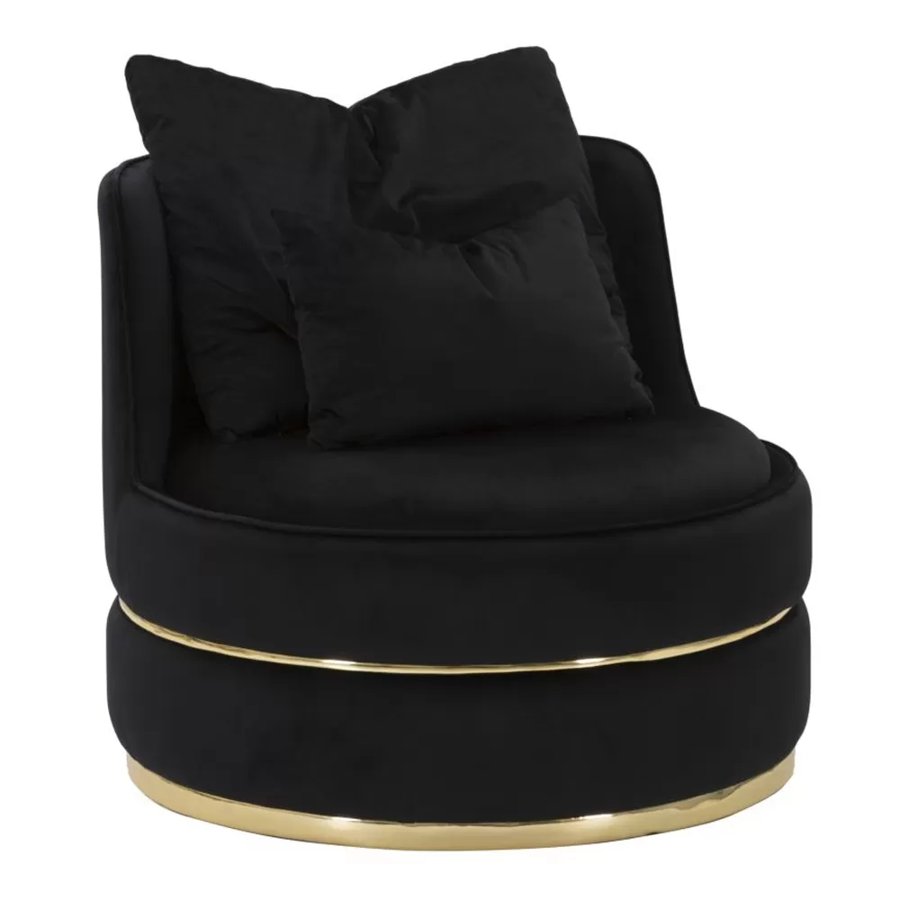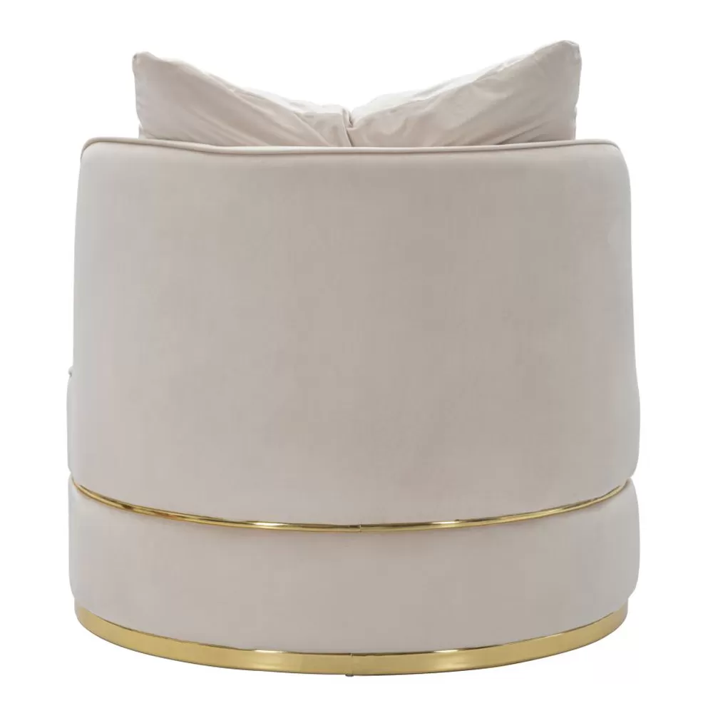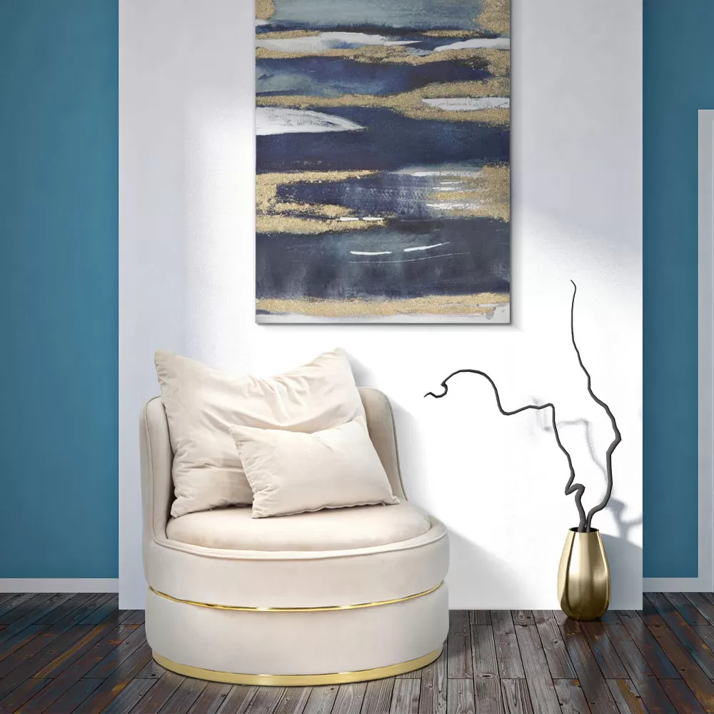 Modern living room armchair entirely covered in fabric with gold or silver details.