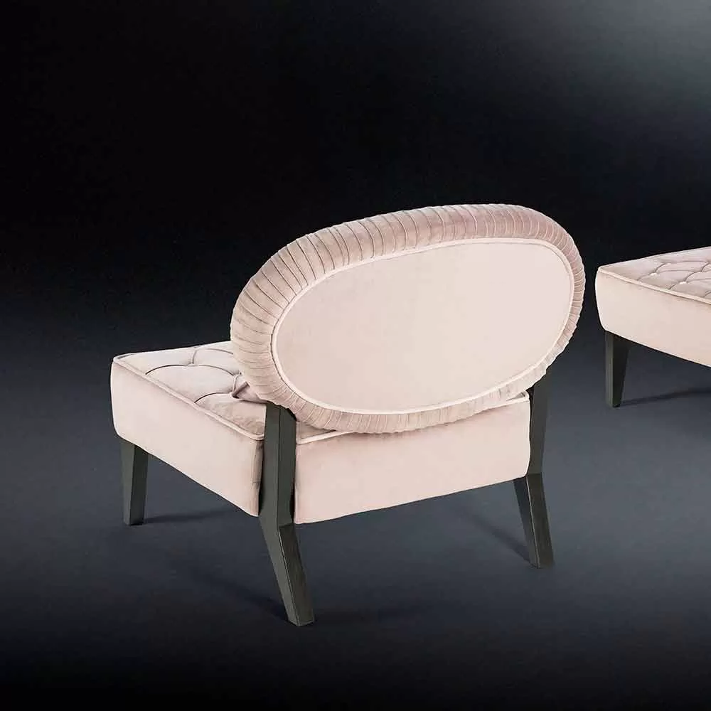Elizabeth has a smooth velvet cover in the taupe colour. The cushions are decorated with buttoned upholstery.