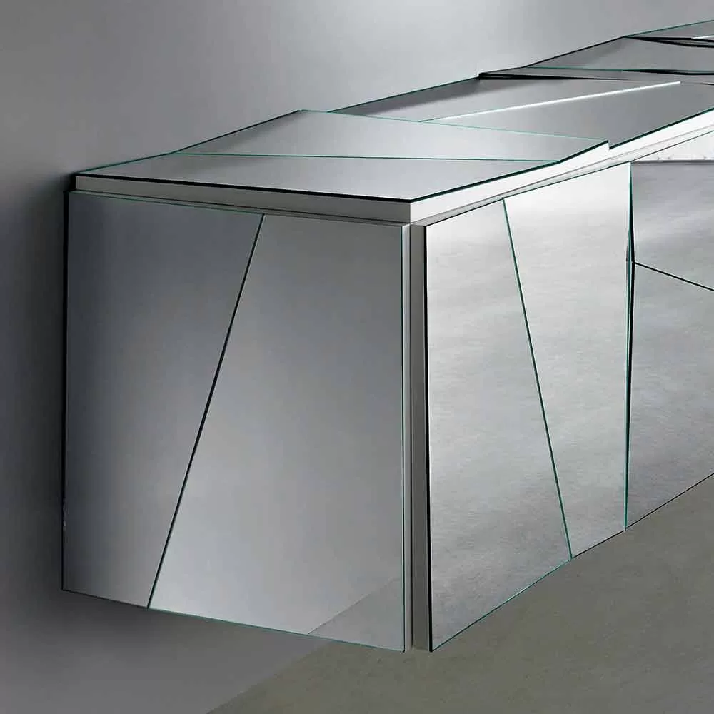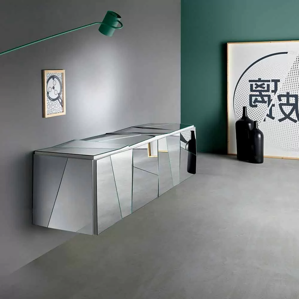 Suspended sideboard for living room in white lacquered wood and mirrored glass made in Italy.
