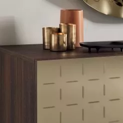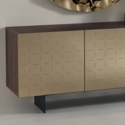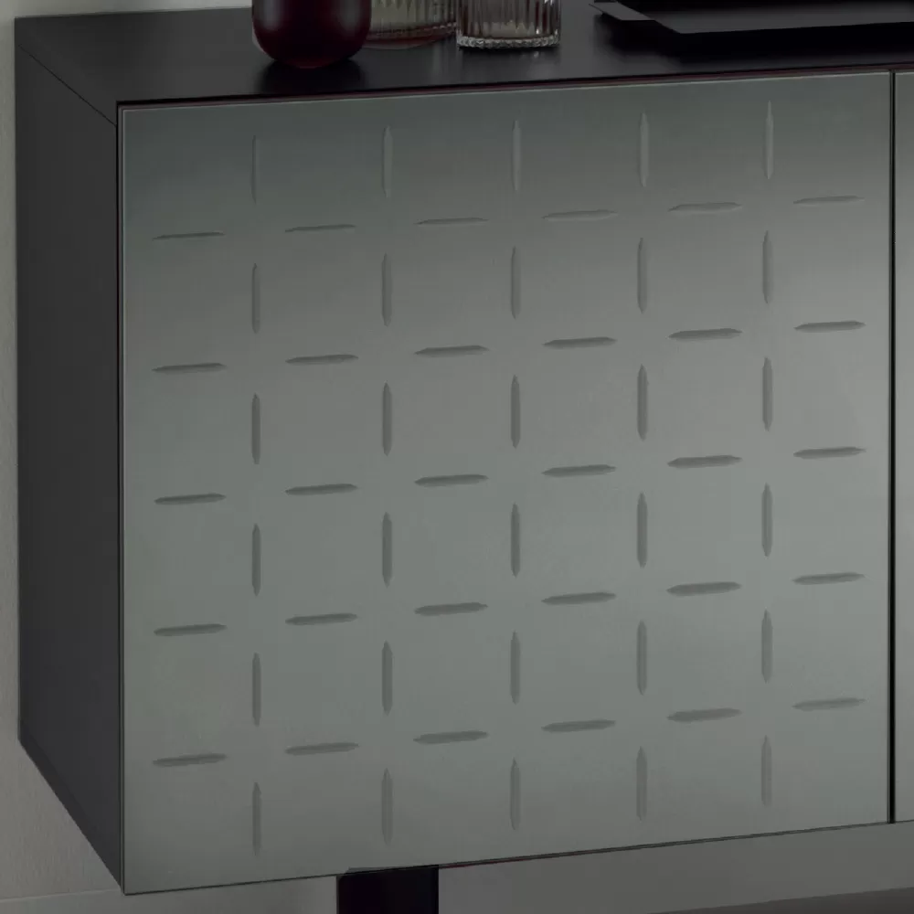 The marvelous doors in mirror finish enrich the aesthetics of the product by giving light and brilliance to the entire room while the creative decoration with geometric lines that characterizes the surface is fundamental to create a sense of dynamism, making the rigorous shape of the sideboard more gentle.