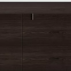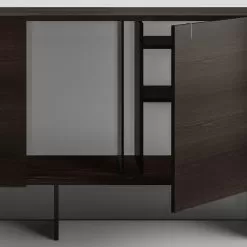 Modern living room sideboard made in Italy with top, bottom and doors in continuous grain wood and external sides, internal sides, back and base in glass . Its structure includes practical compartments and sliding doors that open 180 ° on themselves, equipped with handles in polished gunmetal finish which, in addition to acting as an elegant design detail, integrate the functional magnetic opening and locking system .
