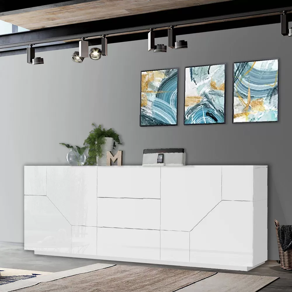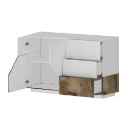 Low living room sideboard made in Italy with melamine wood structure in simple but elegant tones. It consists of compartments with hinged opening that offer an excellent storage space for the most varied objects and 3 sliding central drawers that make the product even more functional. The white or wood finish front, combined with the two finishes that cover the top and bottom of the product, captures the attention, creating a chic and elegant effect for a simple and interesting play of colors.