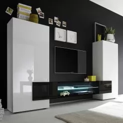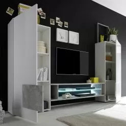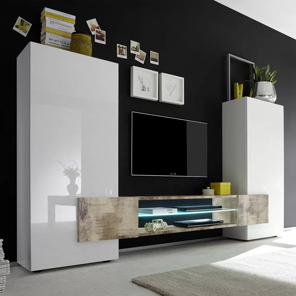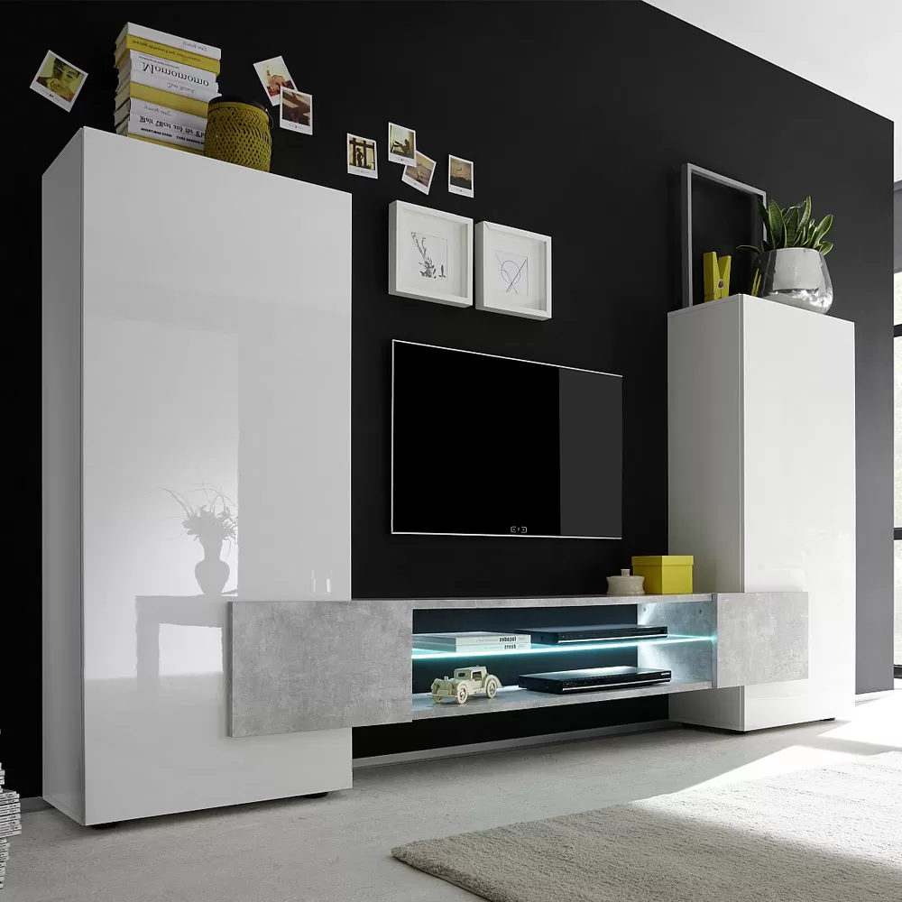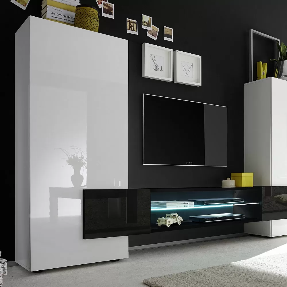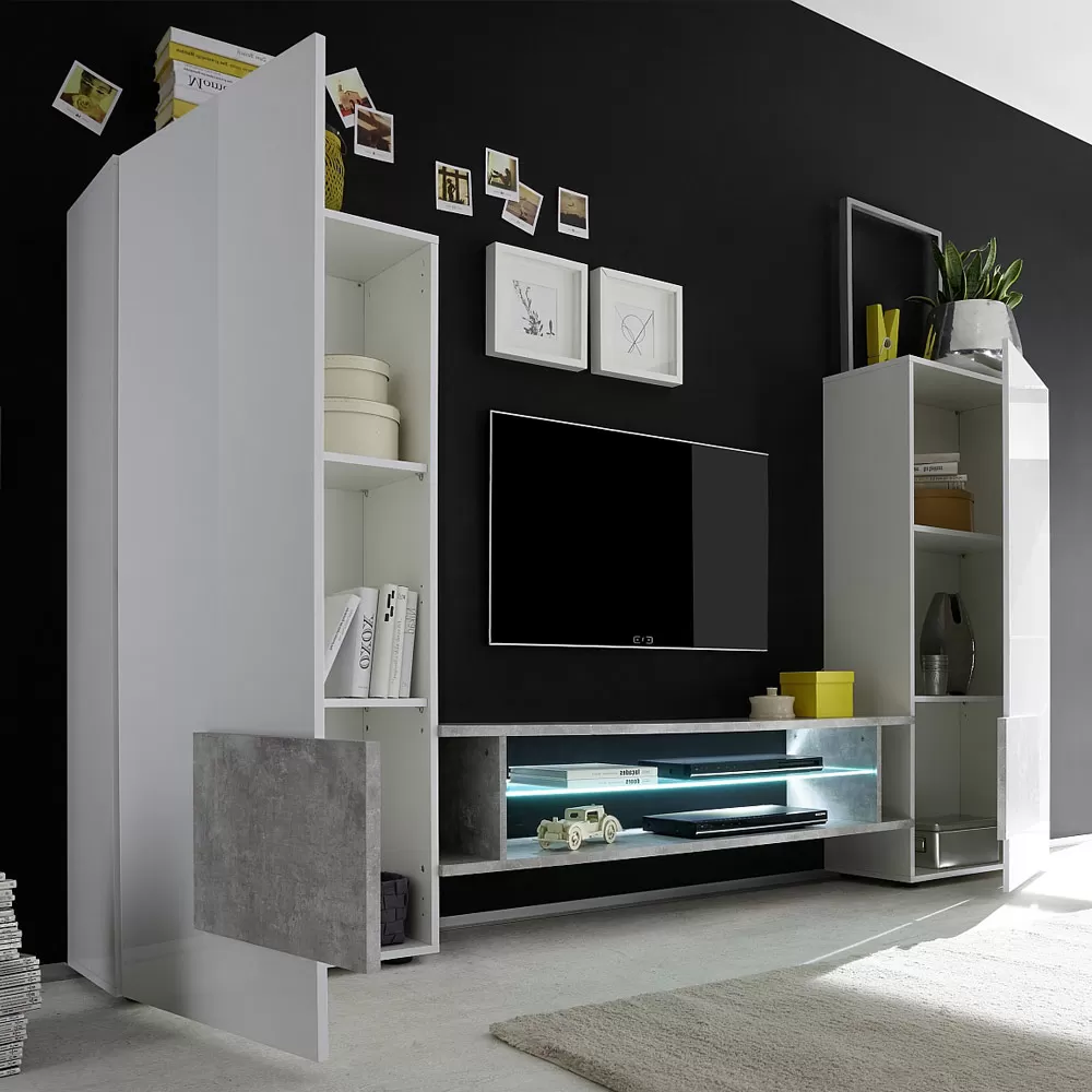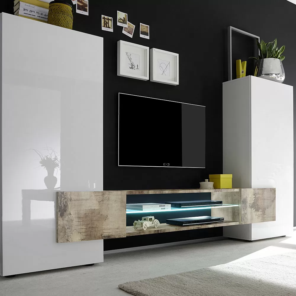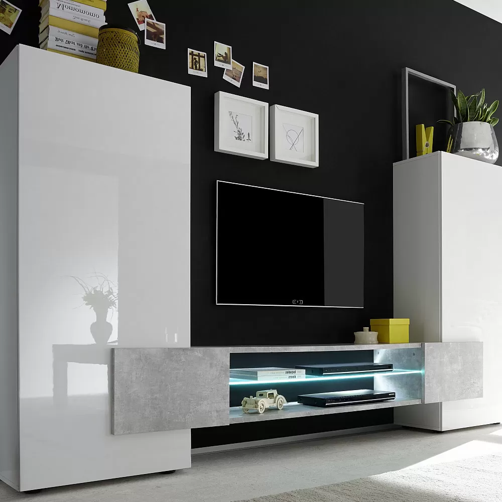 TV stand entirely made in Italy with melamine-coated particle wood structure complete with 2 doors equipped with 2 practical shelves each and a large open compartment equipped with an elegant glass shelf illuminated with neon light , ideal for storing DVD player, decoder or console. A furnishing solution with an undoubtedly modern line capable of breaking up the decor of any living area with grit and originality without having to give up the sober elegance that distinguishes its design.