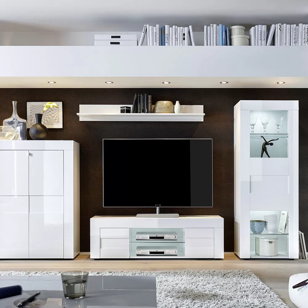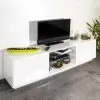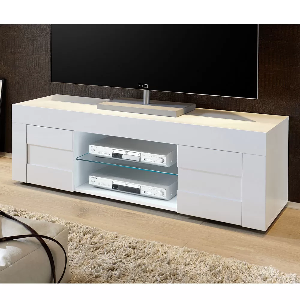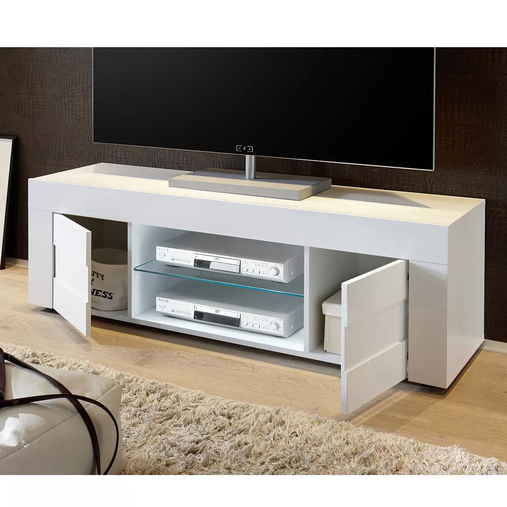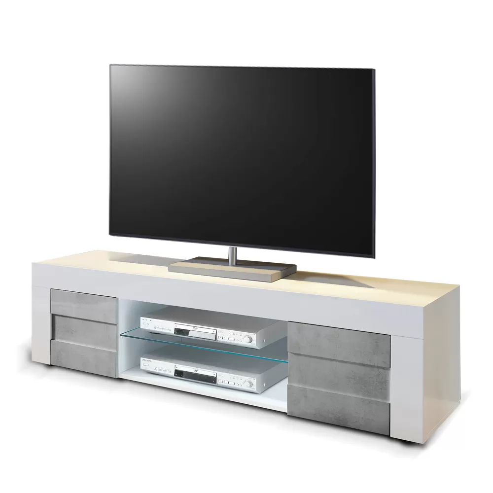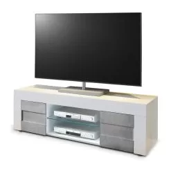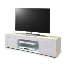 TV stand for living room entirely made in Italy in chipboard covered with melamine complete with 2 side doors and one practical central shelf in glass . A piece of furniture with an eclectic and essential style , designed to furnish any living area with a contemporary design with elegance and taste thanks also to the two finishes proposed which are particularly versatile and therefore ideal within any furnishing context.