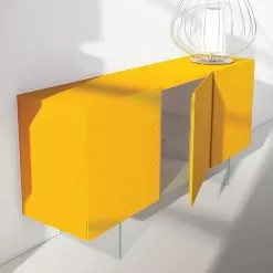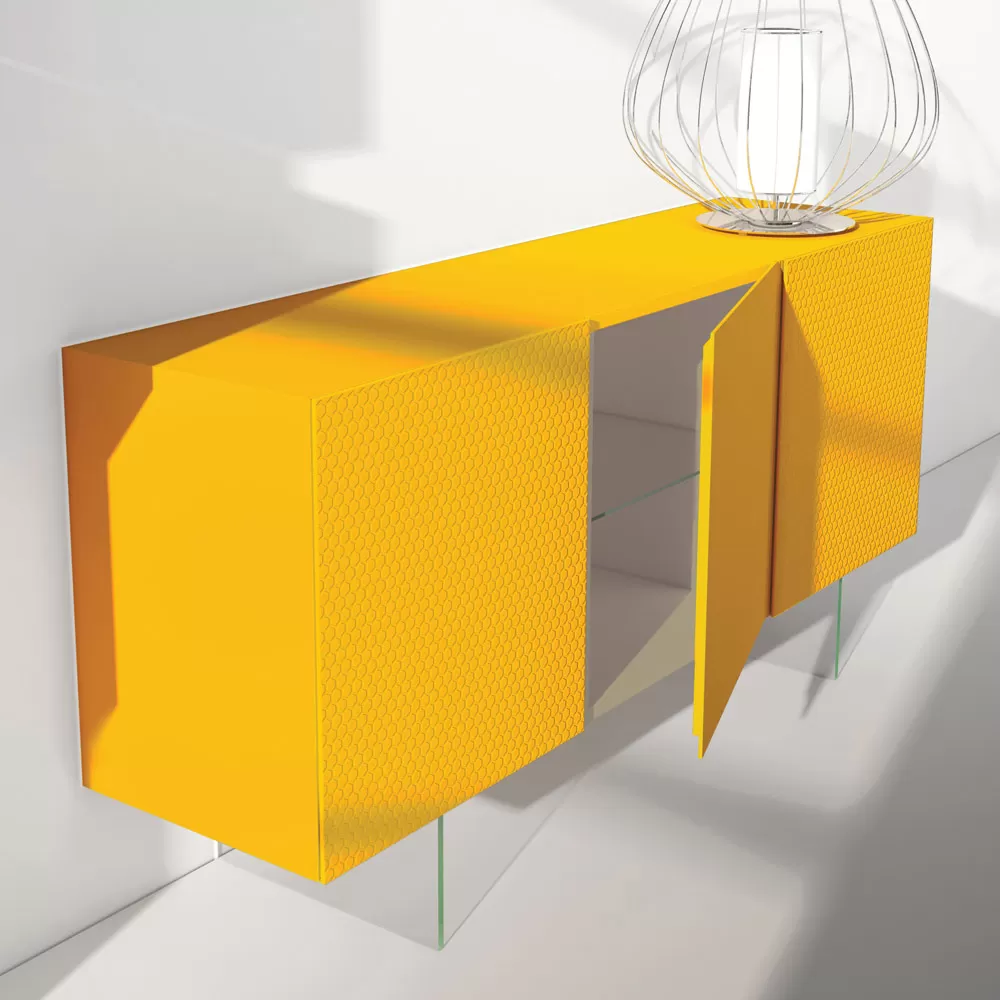 Living room sideboard with canary yellow matt lacquered MDF structure also including extra-clear glass feet . The opening system has 3 hinged doors  to ensure perfect functionality and practicality . This product is marked by taste and design thanks to the union of various materials, its elegant and refined finishes and embellished by the decoration on the door made up of many small HPL honeycomb-shaped tiles . All the materials used for the construction offer great quality and resistance over time, giving the product that unique and unforgettable touch.
